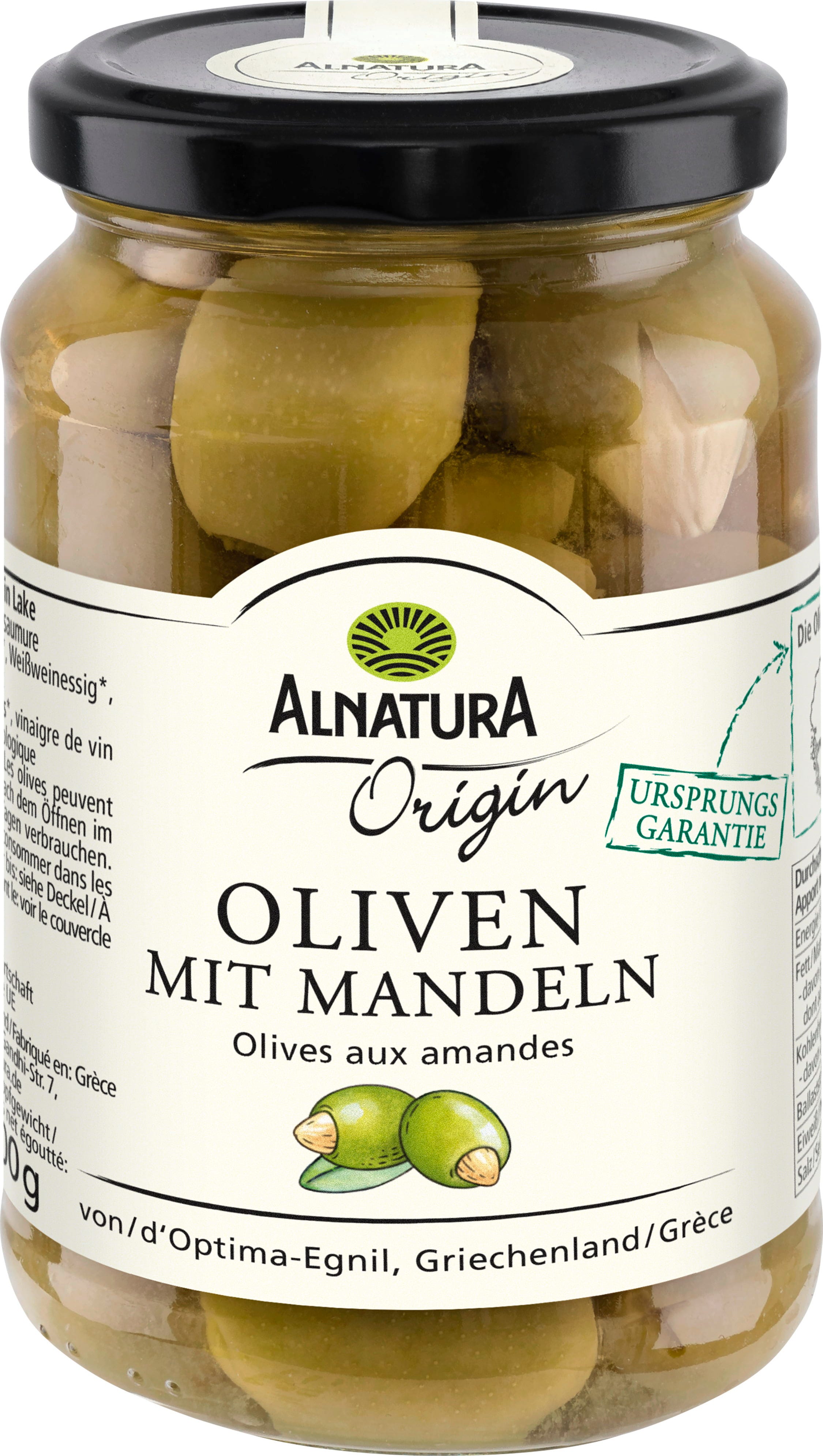 ¿Le falta algo a tu plato de antipasti? Con las aceitunas ecológicas de la línea Origin con almendras de Alnatura vas sobre seguro. La pulpa firme y el delicado sabor de las aceitunas verdes se combinan armoniosamente con las almendras crujientes y ligeramente dulces. Aceitunas recogidas a mano, conservadas en salmuera con sal marina y un toque de vinagre de vino blanco. En calidad ecológica.