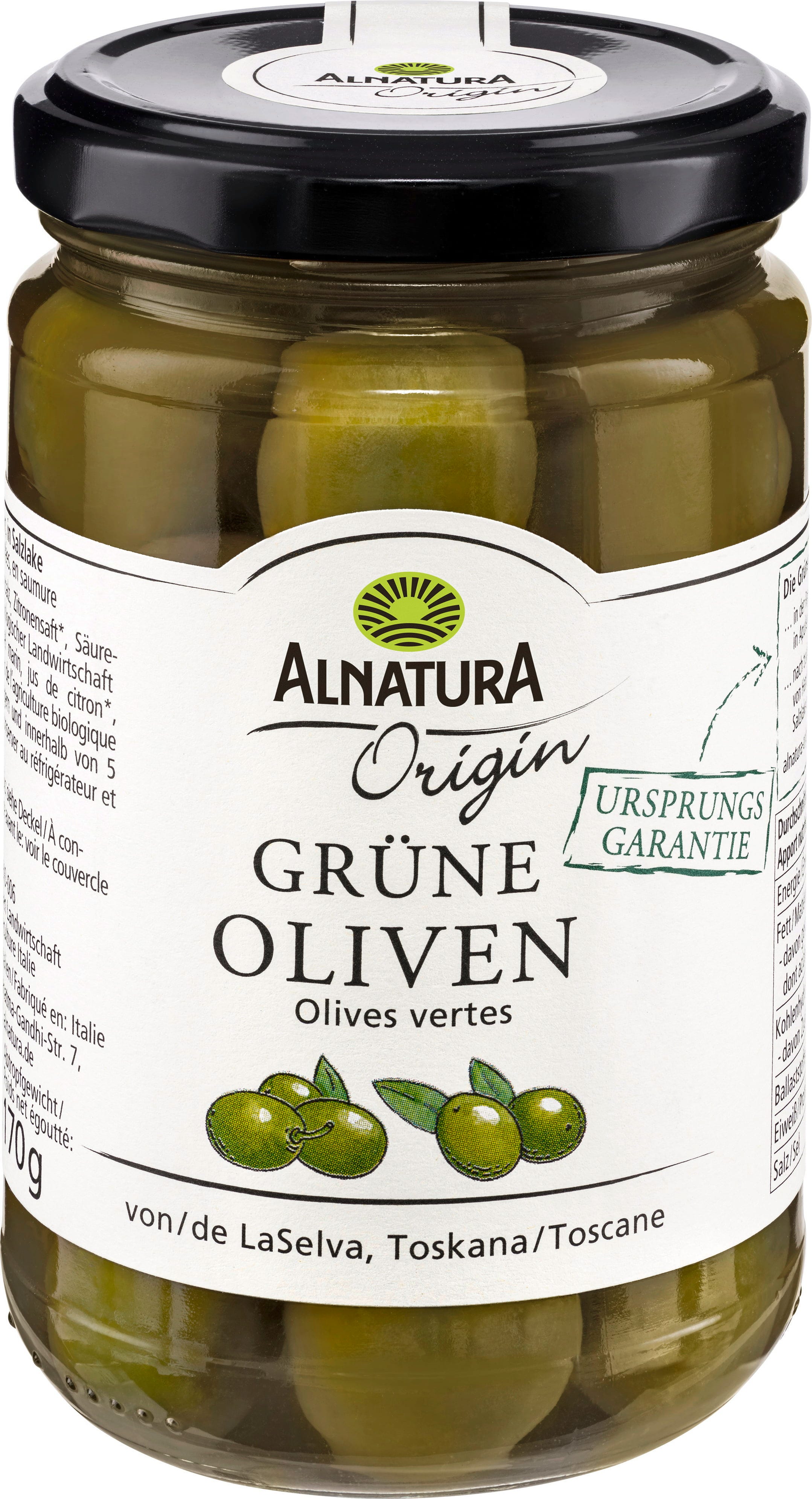 Las aceitunas verdes bio Origin con hueso de Alnatura proceden de Italia. Estas aceitunas de aroma suave convencen por su pulpa firme. Con su color verde intenso, son ideales para ensaladas, pasta, como ingrediente para pizzas o en un plato de entremeses.