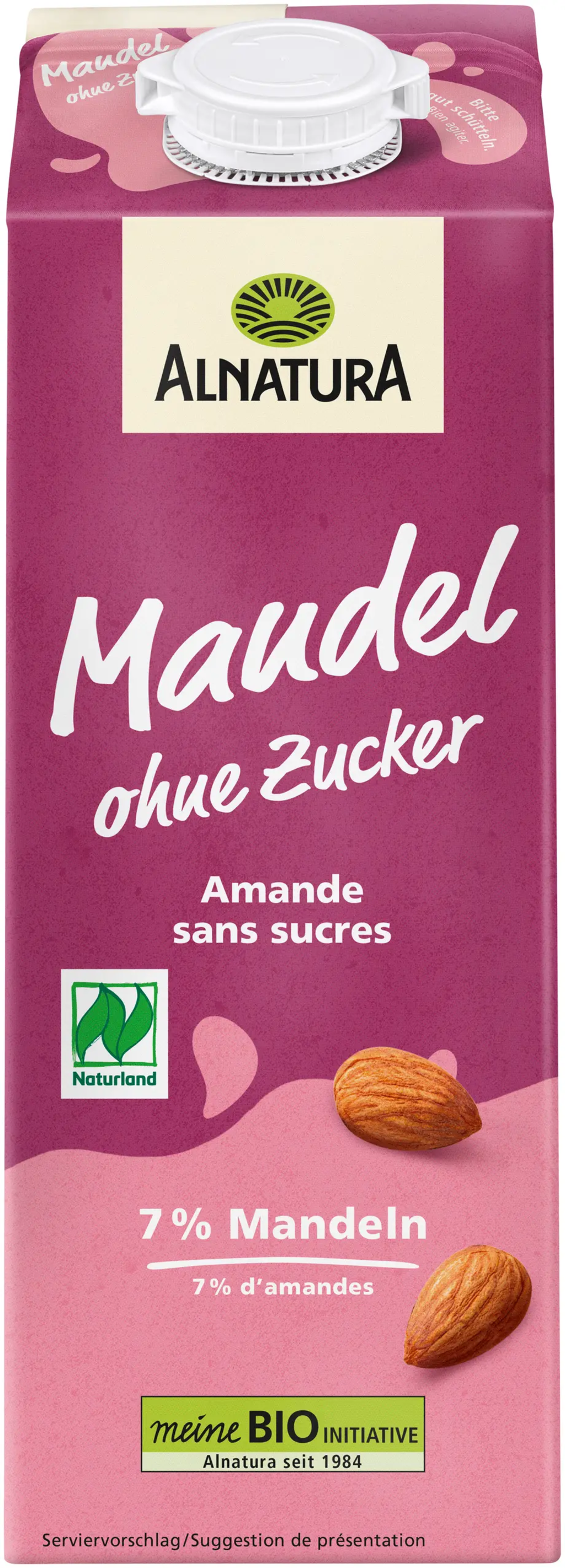La bebida de almendras sin azúcar* de Alnatura sabe muy bien sola o como sustituto vegano de la leche en el café, los batidos, el muesli o la repostería. Se elabora sin estabilizantes y no contiene gluten ni lactosa. Las almendras proceden de España, donde se cultivan según las directrices de Naturland.