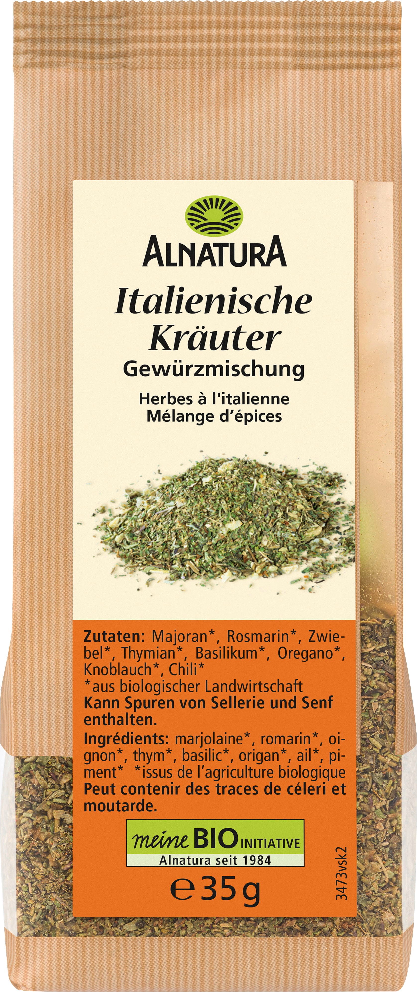 Con las hierbas italianas ecológicas de Alnatura llevarás a la mesa la fragancia del sol y del Mediterráneo. Esta armoniosa mezcla de mejorana, romero, cebolla, tomillo, albahaca, orégano, ajo y guindilla de cultivo ecológico aporta a sus platos una nota típicamente mediterránea. Ideal con pizza y pasta, platos de patatas y verduras, o con caza, cordero y pescado.