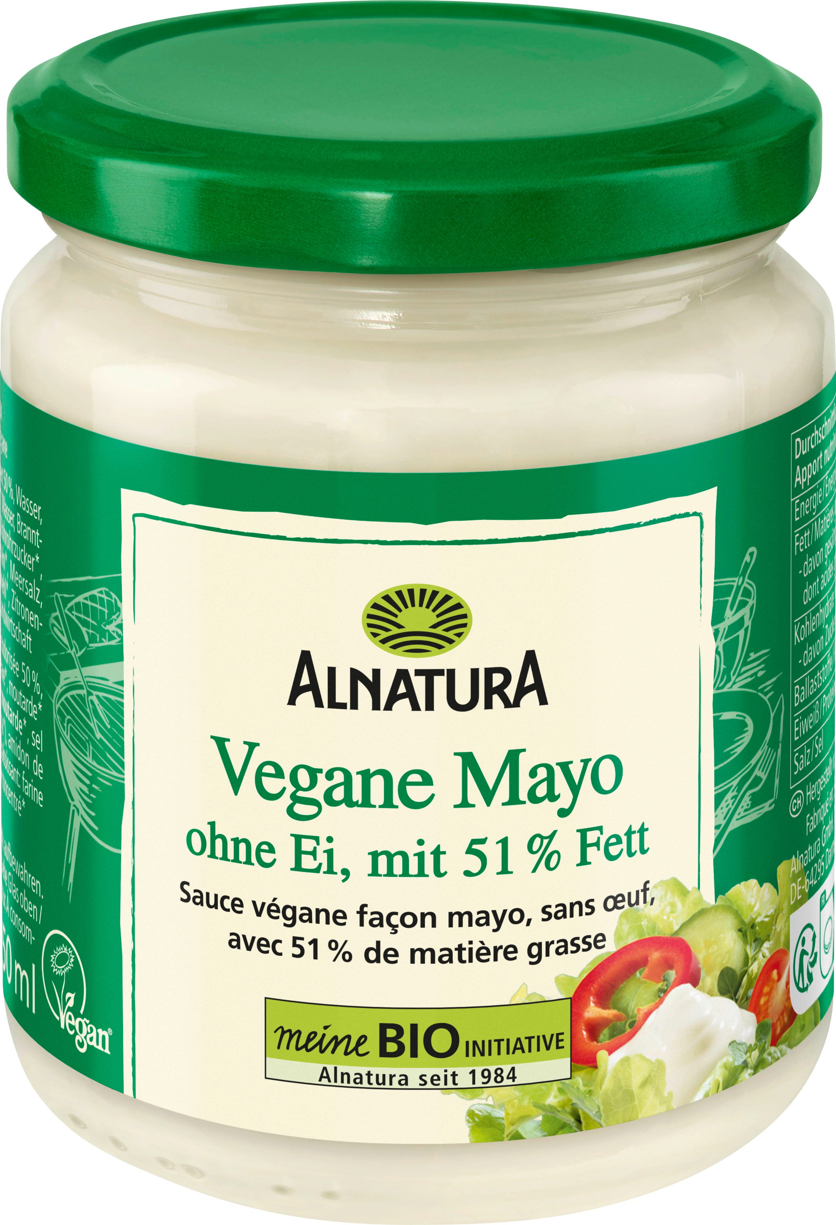 La mayonesa vegana ecológica de Alnatura es la alternativa vegetal a la mayonesa clásica porque no contiene huevo. Conquista por su agradable sabor, consistencia cremosa y 51% de contenido graso. Perfecta para ensaladas, salsas y dips.