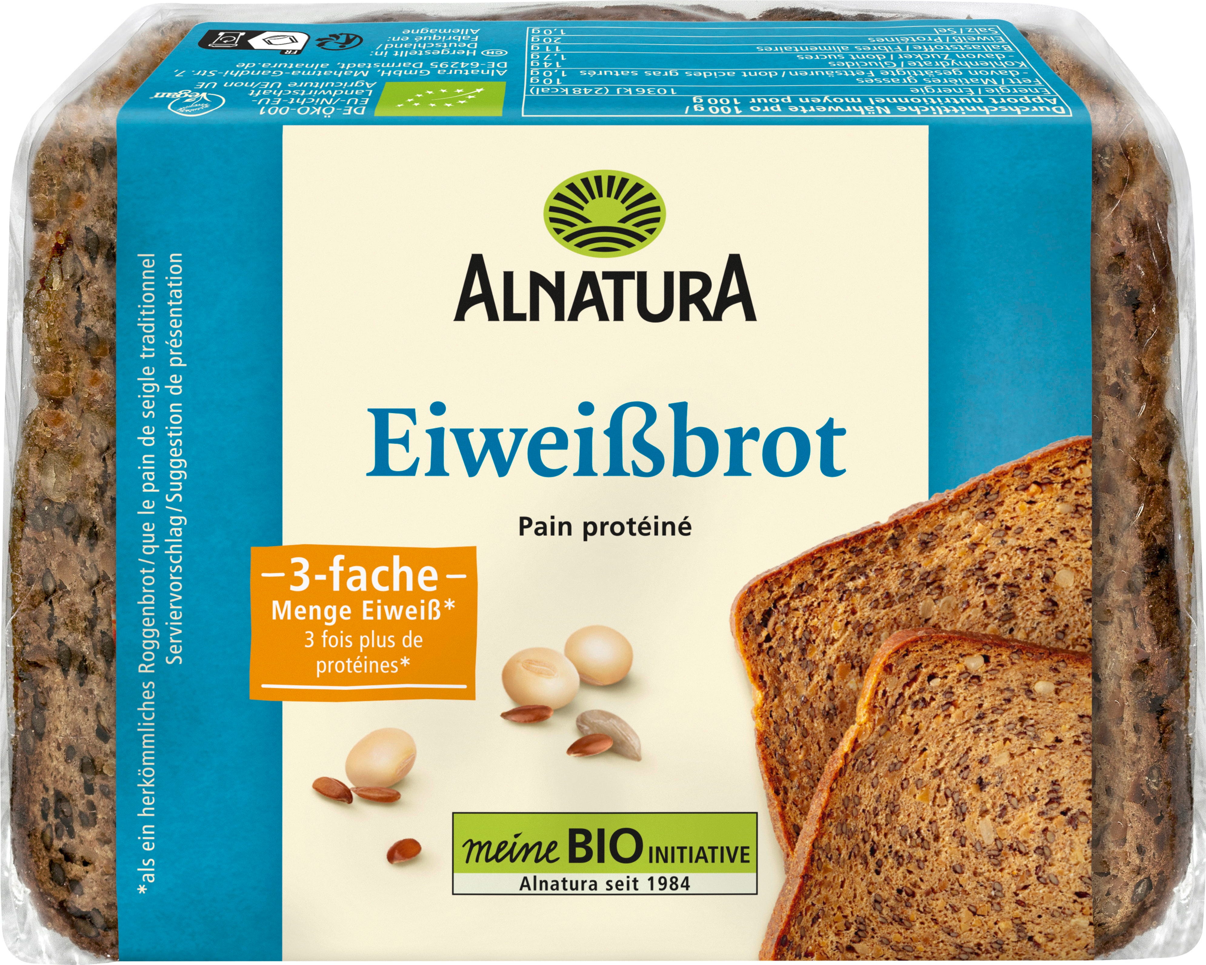 El jugoso pan proteico de Alnatura se elabora a base de harina de centeno integral, proteína de trigo, semillas de lino y sémola de soja. Este pan rico en proteínas ya viene cortado en prácticas rebanadas. Es ideal para tostar y se puede disfrutar con todo tipo de ingredientes.