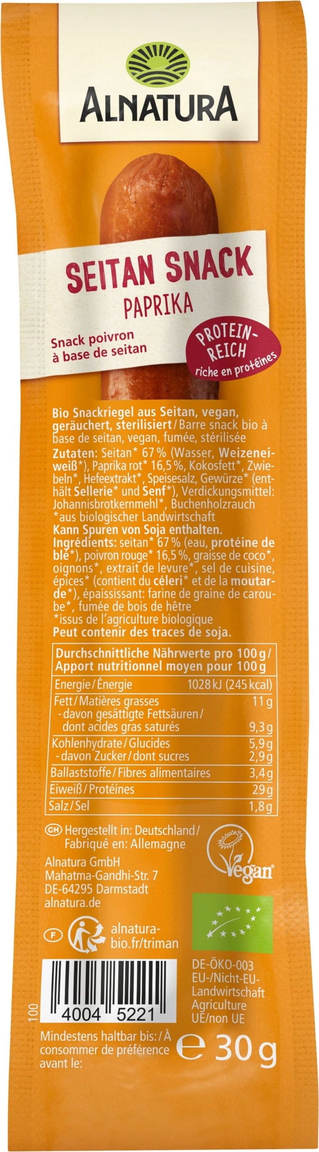 El Snack de Seitán Ecológico - Pimentón es una alternativa vegana de sabor intenso para un aperitivo salado. Elaborado con seitán rico en proteínas y aromatizado con pimentón, conquista por su fuerte carácter. Puede conservarse sin refrigeración y también es perfecto para comer fuera de casa.