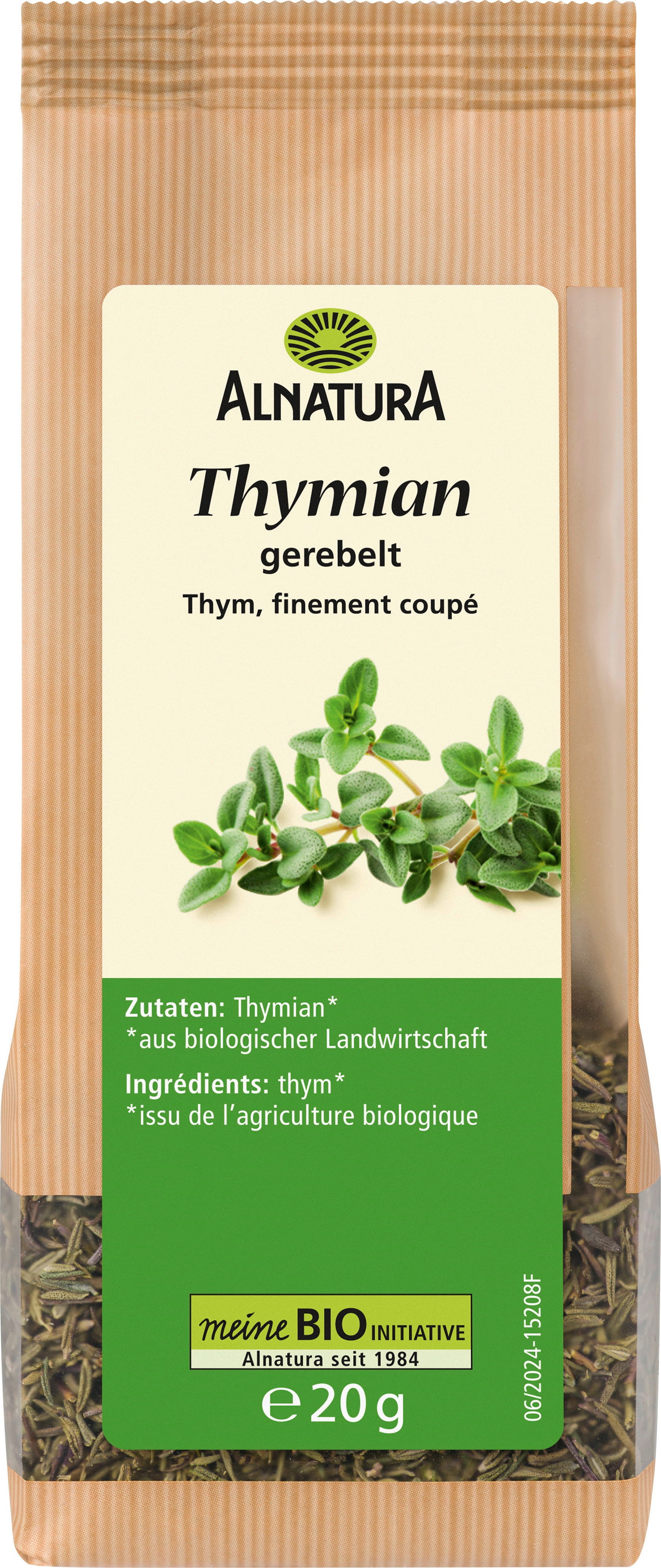 El sabor intenso y ligeramente amargo de esta hierba aromática lleva el aroma del verano a la cocina. Ideal con patatas, verduras y cordero, el tomillo ecológico de Alnatura da a los platos una nota especial. Se pica, es decir, las hojas secas se separan del tallo y se cortan. Durante la cocción desarrolla plenamente su aroma.