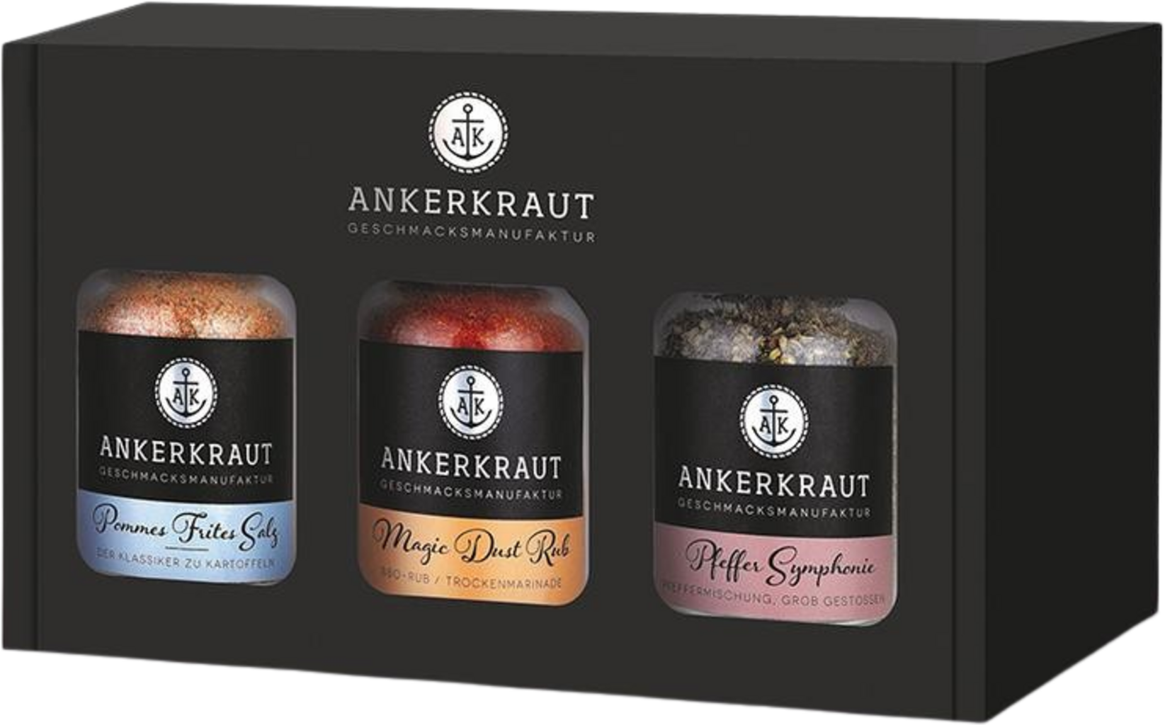 Tres mezclas exclusivas para tener siempre en la despensa, o los bestsellers de Ankerkraut. Sal, pimienta y especias para barbacoa en un delicioso y hermoso trío en su elegante caja de cartón negro. También es ideal como regalo para los amantes de la cocina.