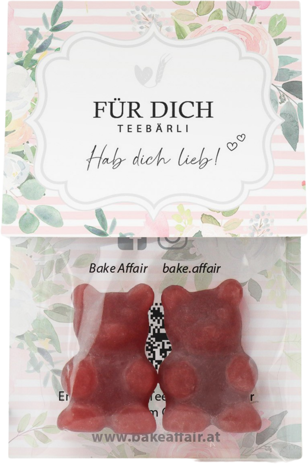 Regala un capricho dulce con los ositos de té "For You" de Bake Affair. Disueltas en agua caliente, se convierten en un té de frutas con un intenso aroma y un armonioso sabor a frambuesa y vainilla. El envase lleva la inscripción "¡Te quiero!" en alemán y encierra tiernos ositos de gominola, que también son perfectos para disfrutar directamente como un pequeño tentempié dulce.