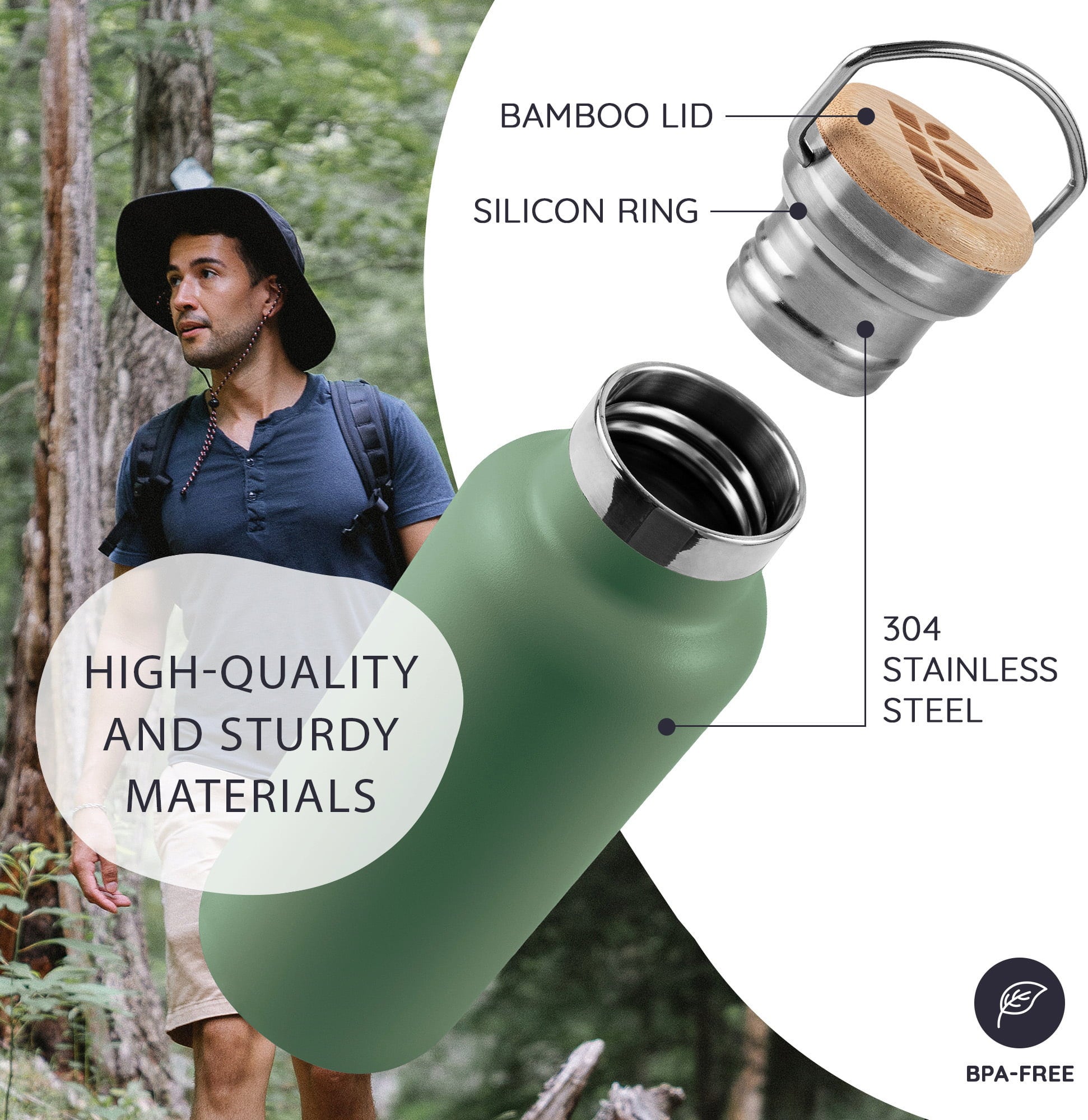 El termo de acero inoxidable es elegante y atemporal. No contiene plástico, tiene un tapón de rosca a prueba de fugas con madera de bambú y una gran abertura por la que también caben cubitos de hielo, huevos de té o fruta. En los calurosos días de verano, la botella mantiene las bebidas frías hasta 24 horas y calientes hasta 12 horas en invierno. Después de usarla, la botella se puede limpiar fácilmente con un cepillo.