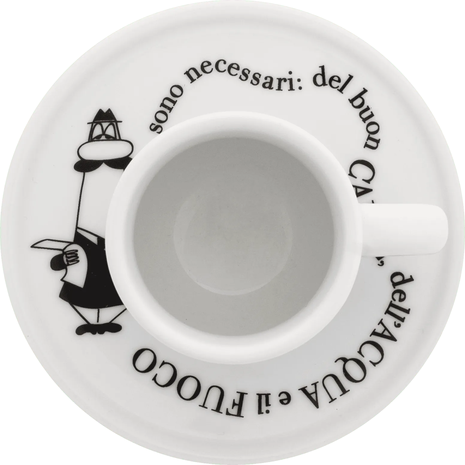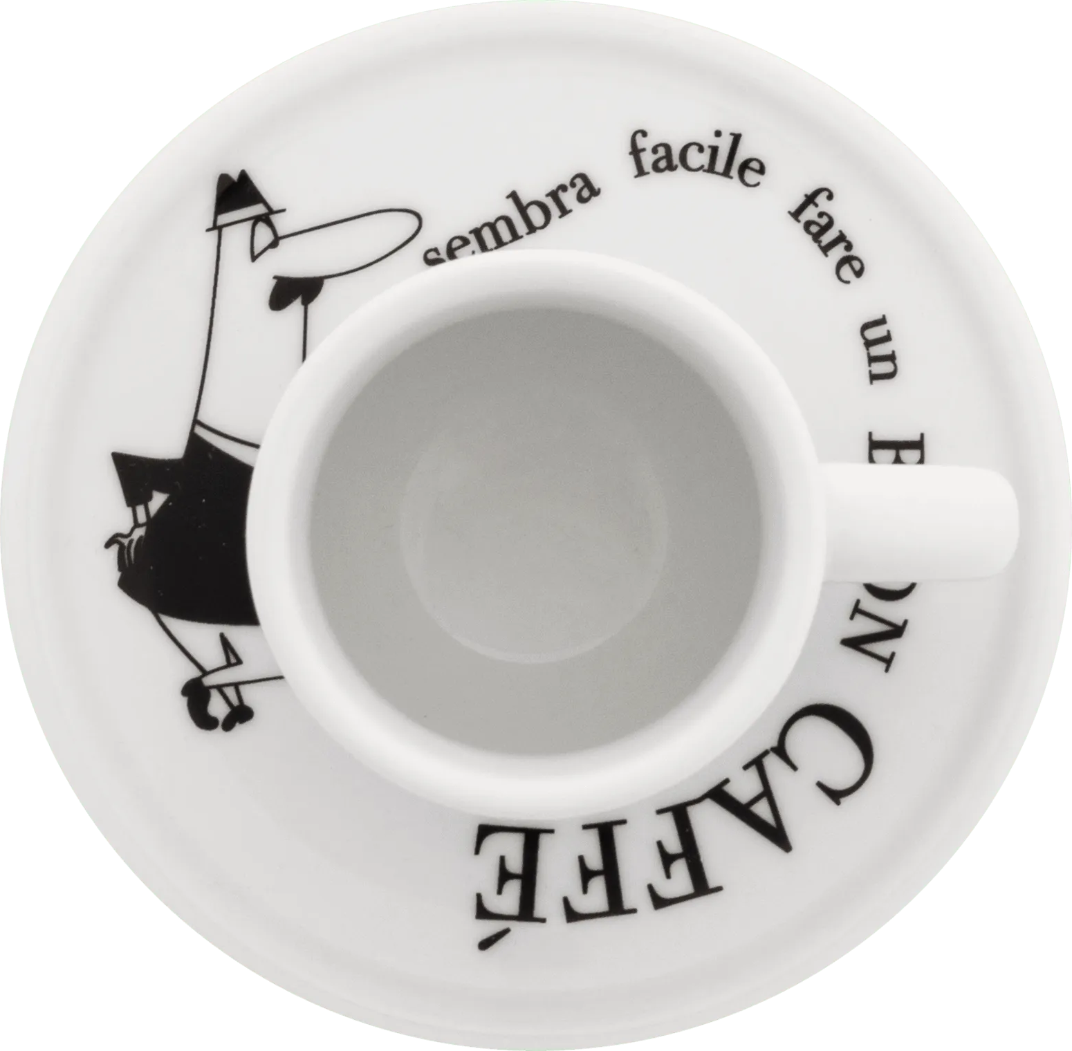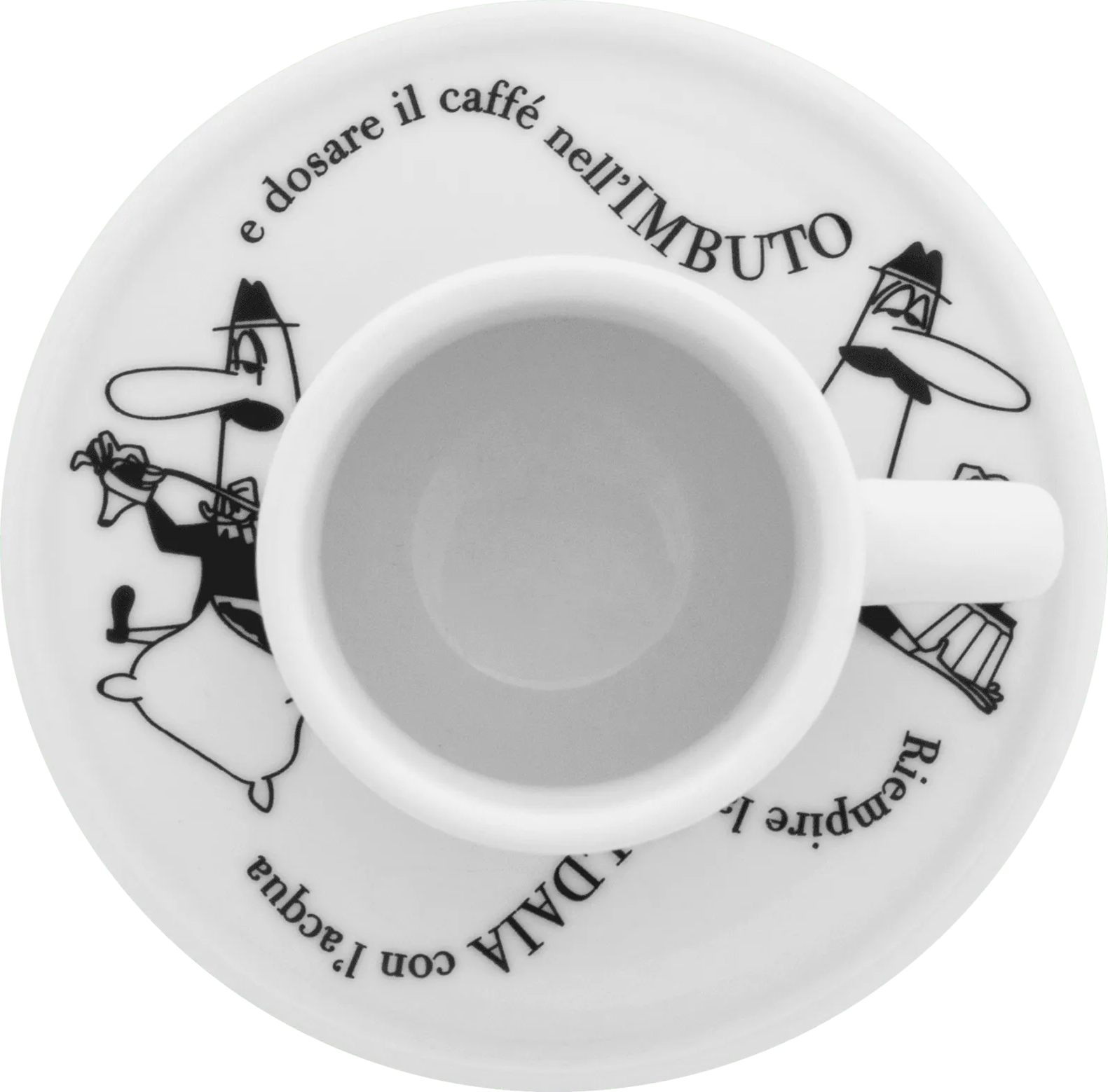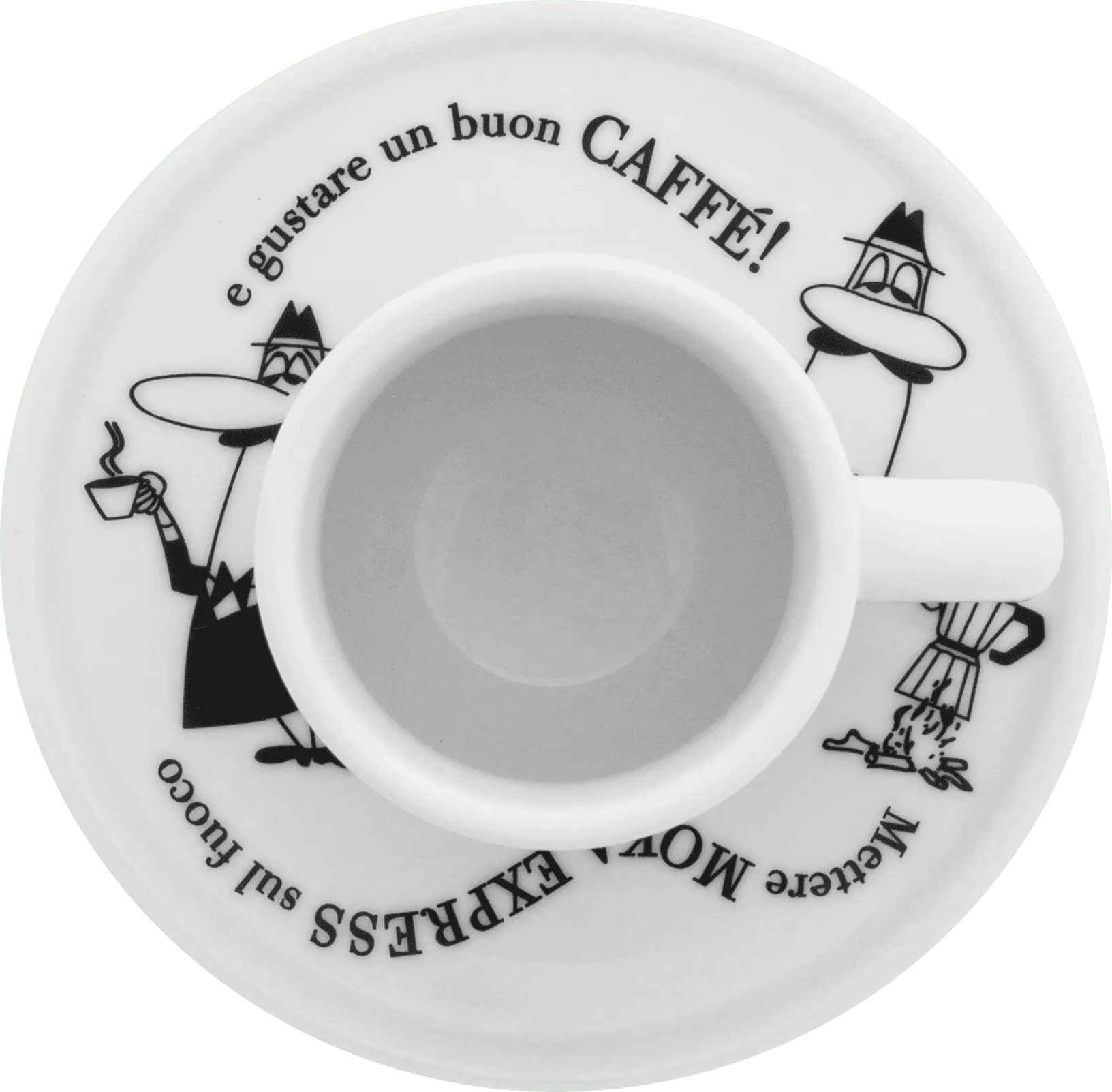 Las tazas y los platitos de este juego están decorados con el icónico hombrecillo de Bialetti y la historia de la preparación del café con la Moka Express.