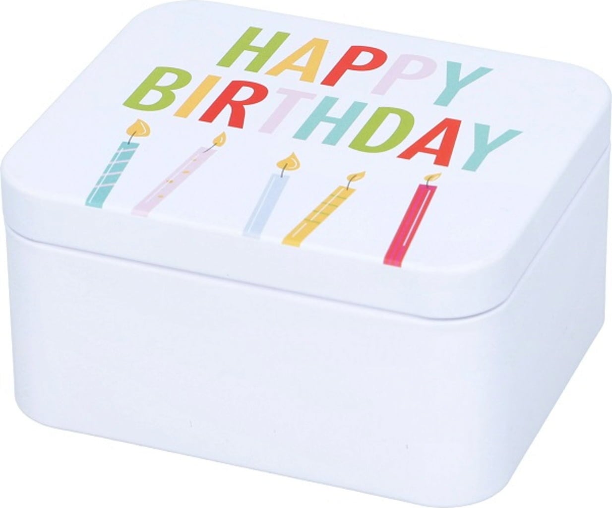 La caja de regalo "Feliz cumpleaños" de Birkmann es el envase perfecto para dulces caseros o pequeños regalos. Con su elegante color blanco y la inscripción "Feliz Cumpleaños", convierte cada cumpleaños en una ocasión especial. Ya sean galletas, bombones o pequeños regalos, los obsequios se mantendrán frescos y elegantemente empaquetados en esta práctica caja de metal de alta calidad.