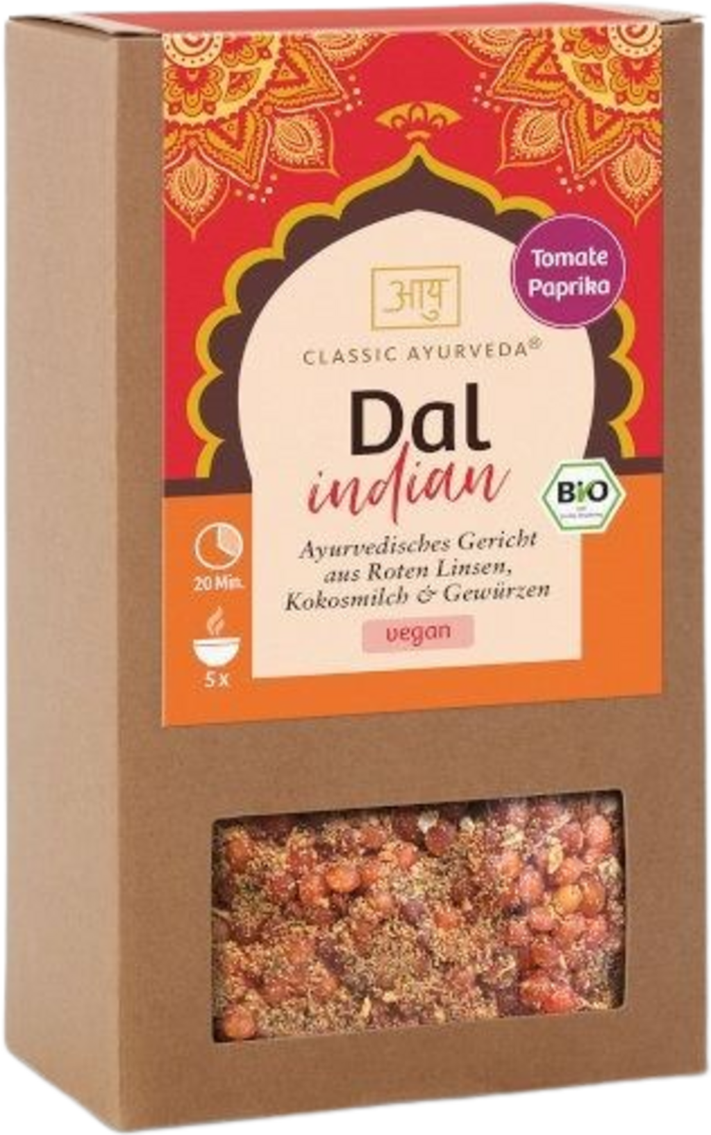 Dal Bio - Indian es una mezcla ayurvédica lista para usar de Classic Ayurveda que permite preparar de forma sencilla y práctica un Dal clásico. La base está compuesta por lentejas rojas, que gracias a la presencia de leche de coco en polvo adquieren una consistencia aterciopelada y cremosa. Los tomates afrutados y las cebollas se armonizan con una composición equilibrada de especias a base de comino, pimentón, jengibre y guindilla. El perfil aromático se completa con sal de roca, semillas de mostaza, perifollo y asafétida. Todos los ingredientes de origen agrícola proceden de la agricultura ecológica controlada y dan lugar a una comida sabrosa y especiada, con un delicado toque picante.