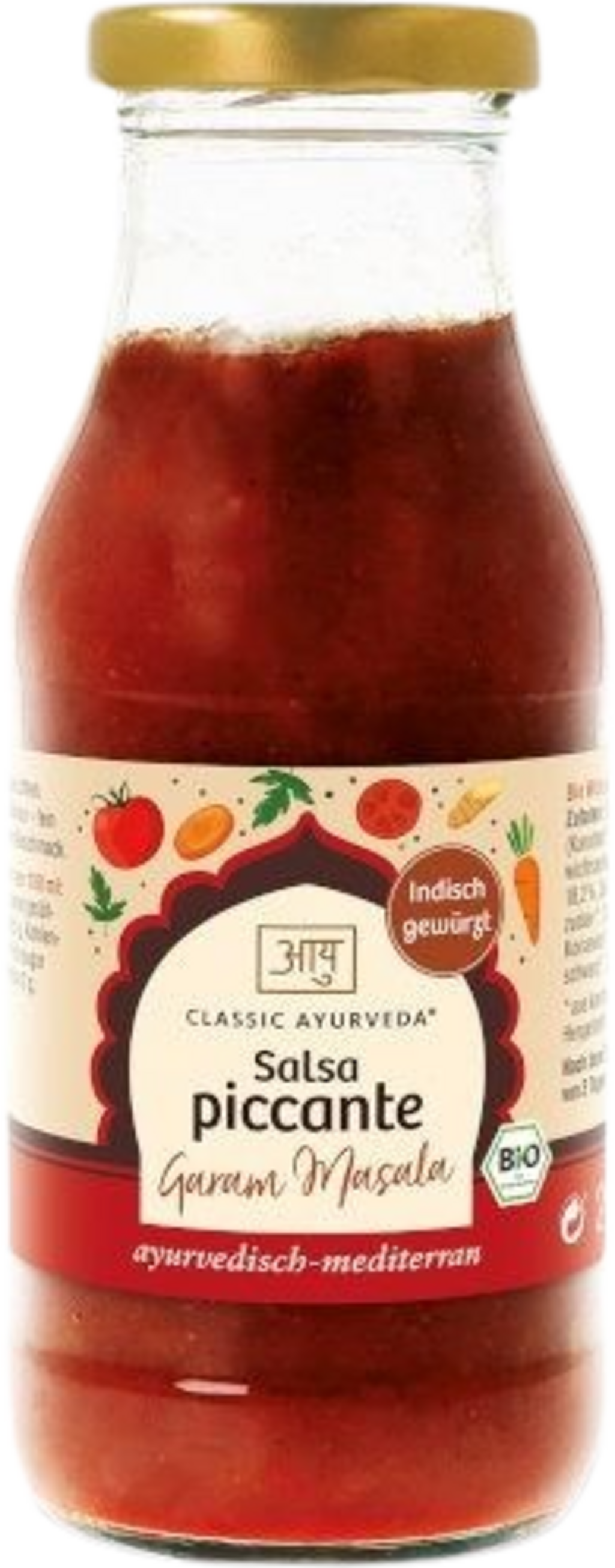 Una salsa picante de inspiración ayurvédica de Classic Ayurveda que combina puré de tomate y concentrado de tomate con una fresca mezcla de verduras a base de zanahorias, puerros y apio. Su particularidad reside en el equilibrio aromático del Garam Masala, una composición de laurel, cilantro, fenogreco, comino, pimienta negra, jengibre, canela de Ceilán y anís. Completada con vinagre balsámico blanco, azúcar de caña y sal de roca, la salsa es ideal como base sabrosa para platos de arroz, curry o pasta. Todos los ingredientes proceden de la agricultura ecológica controlada.