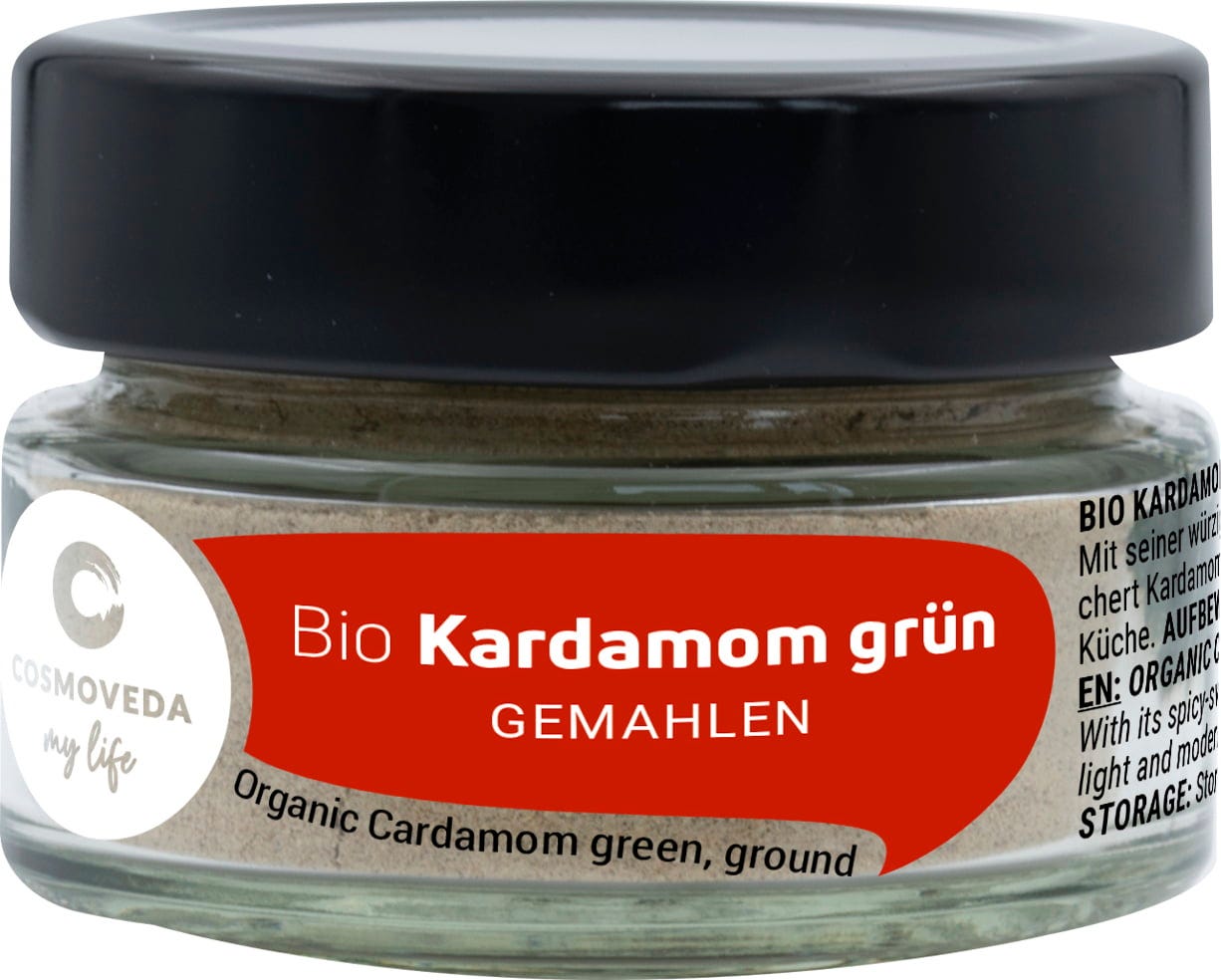 El cardamomo verde contiene semillas negras muy aromáticas que se utilizan molidas para postres, refinar bebidas, leche y café. Las semillas promueven la digestión. El cardamomo es una de las especias más antiguas y valiosas del mundo, justo después del azafrán y la vainilla. Incluso los antiguos griegos y romanos conocían esta especia. La especia proviene del sur de la India, pero hoy también se encuentra en Sri Lanka, Guatemala, Tanzania y Brasil.