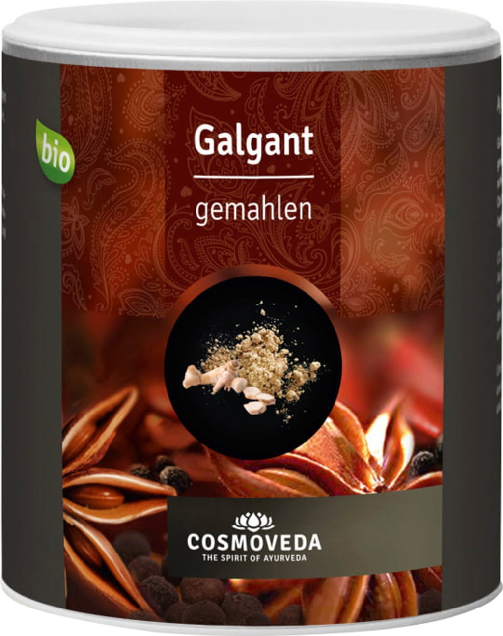 La galanga pertenece a la familia botánica del jengibre, y es originaria del sudeste asiático que se utiliza con frecuencia para caldos, sopas, curry y platos con coco. Es más suave que el jengibre, pero más aromático.