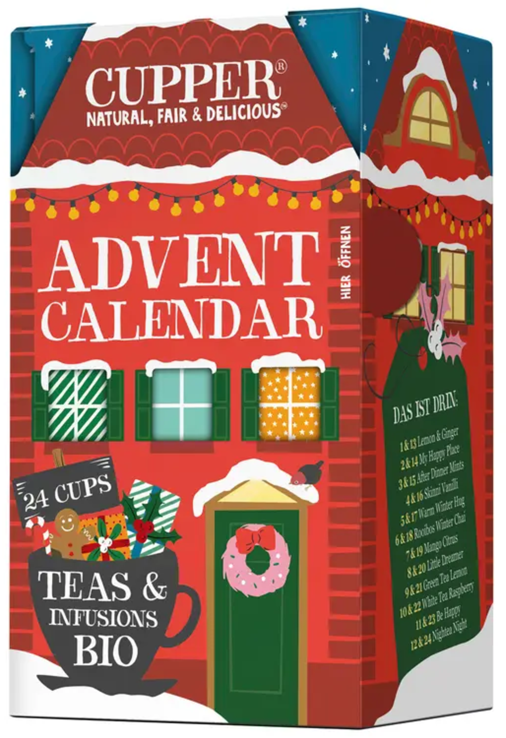 El Calendario de Adviento CUPPER lleva la magia de la Navidad directamente a tu taza. Detrás de 24 ventanas numeradas se esconden preciosas bolsitas de té e infusiones ecológicas de 12 variedades diferentes. Cada mezcla te invita a regalarte un momento de calma y bienestar, mientras el invierno se asoma al exterior. Una idea de regalo perfecta para los amantes del té y las infusiones que quieran hacer aún más dulce la antesala de la Navidad.