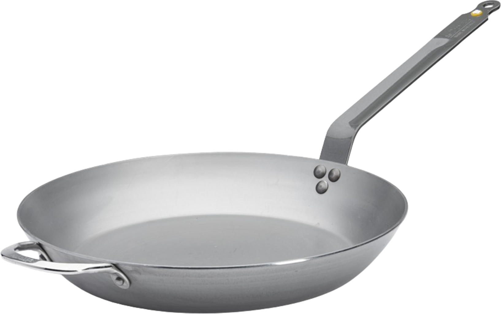 Fabricada en acero de alta calidad y recubierta con una cera de abeja protectora, esta sartén está bien protegida contra la oxidación y también es fácil de sazonar. El mango curvado remachado de estilo francés y el asa del lado opuesto garantizan un cómodo manejo.
