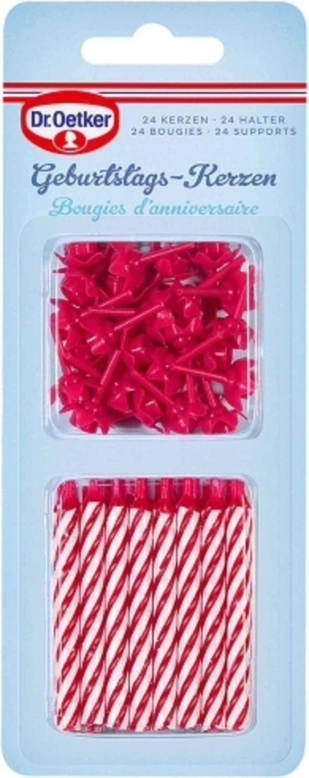 En cada paquete de velas de cumpleaños Dr. Oetker hay 24 velas y 12 soportes para fijarlas fácilmente a tartas o pasteles. Indispensables para celebrar cumpleaños u otras ocasiones especiales.
