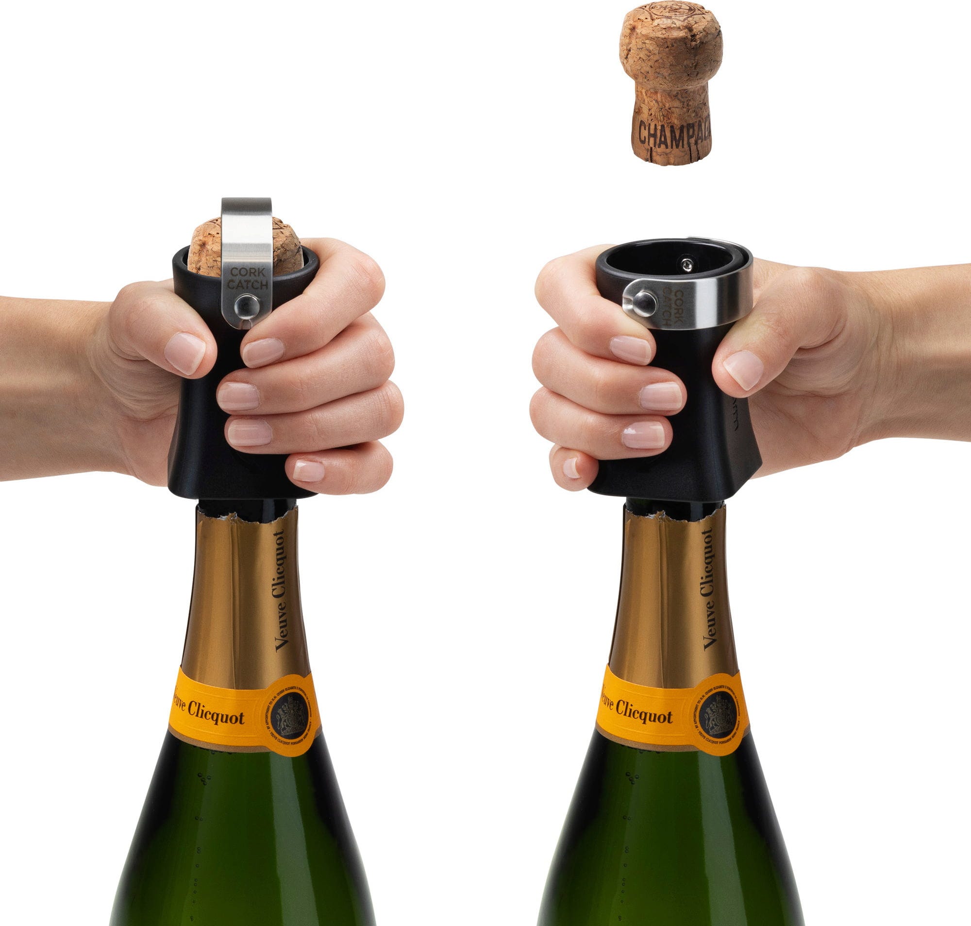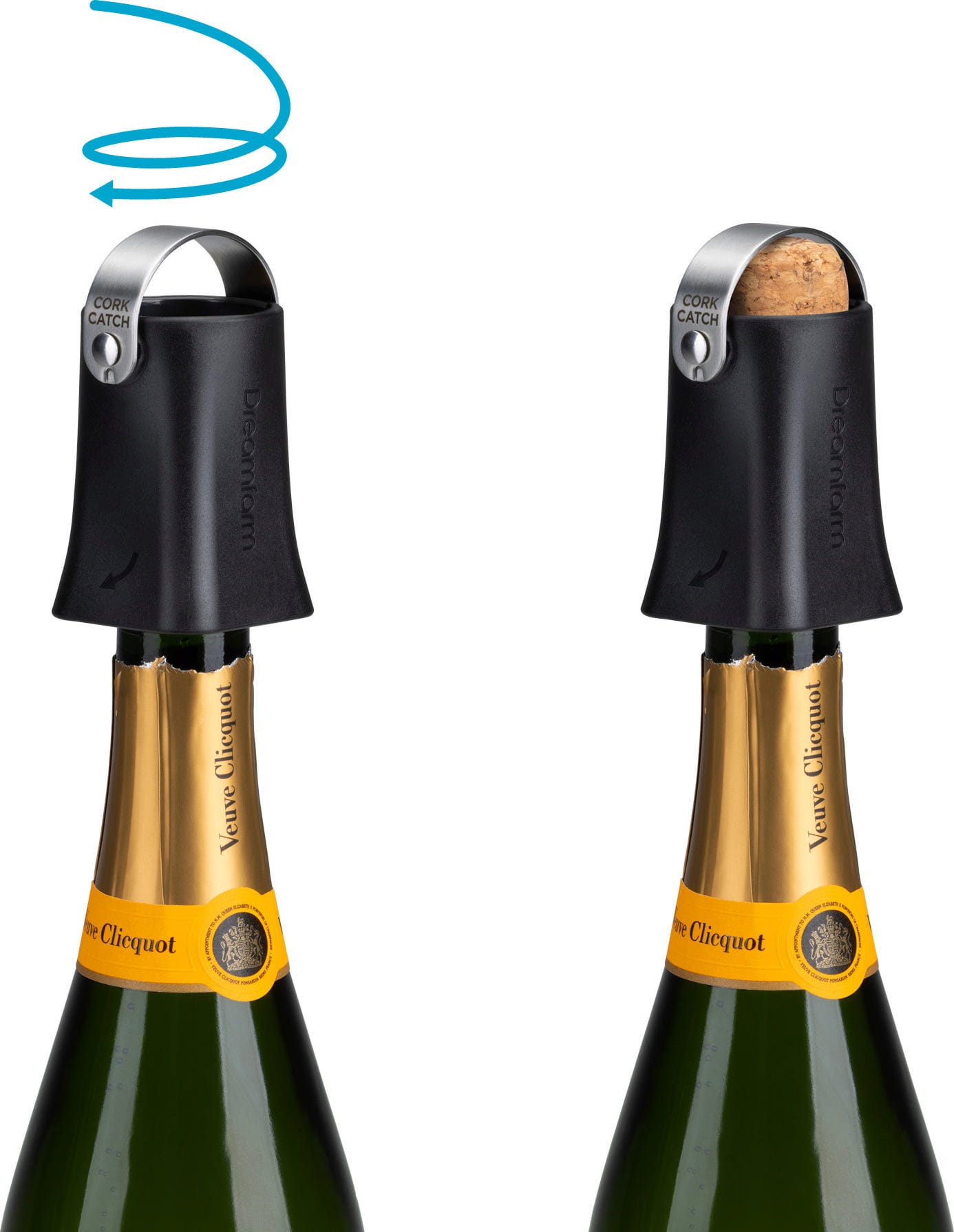 Con Champop de Dreamfarm, ya no tendrás que preocuparte por los tapones que salen disparados de forma descontrolada o por las bebidas que se derraman al abrir una botella de champán. Este ingenioso accesorio se coloca simplemente en el cuello de la botella y se gira ligeramente para liberar el tapón de forma controlada. Gracias a las ranuras de ventilación integradas, la presión se libera suavemente y se reduce la velocidad del corcho, de modo que queda recogido de forma segura dentro del dispositivo: este es el modo Lock.