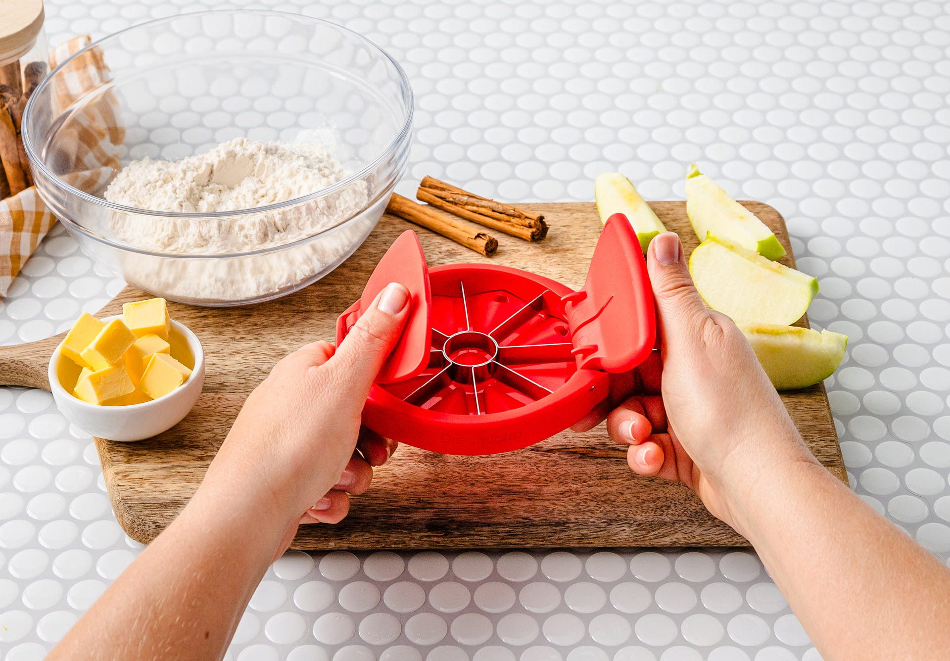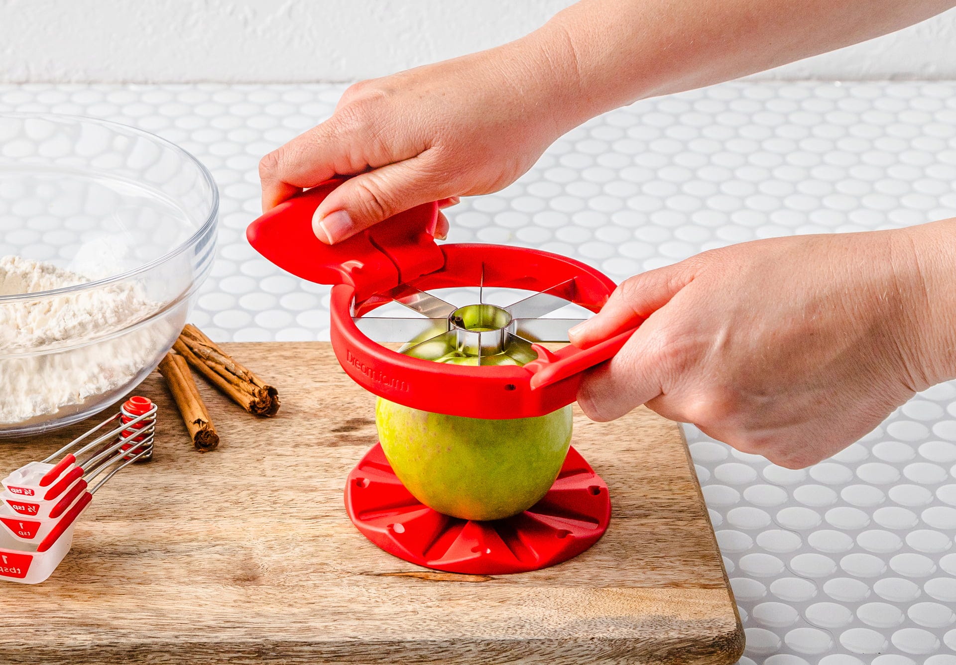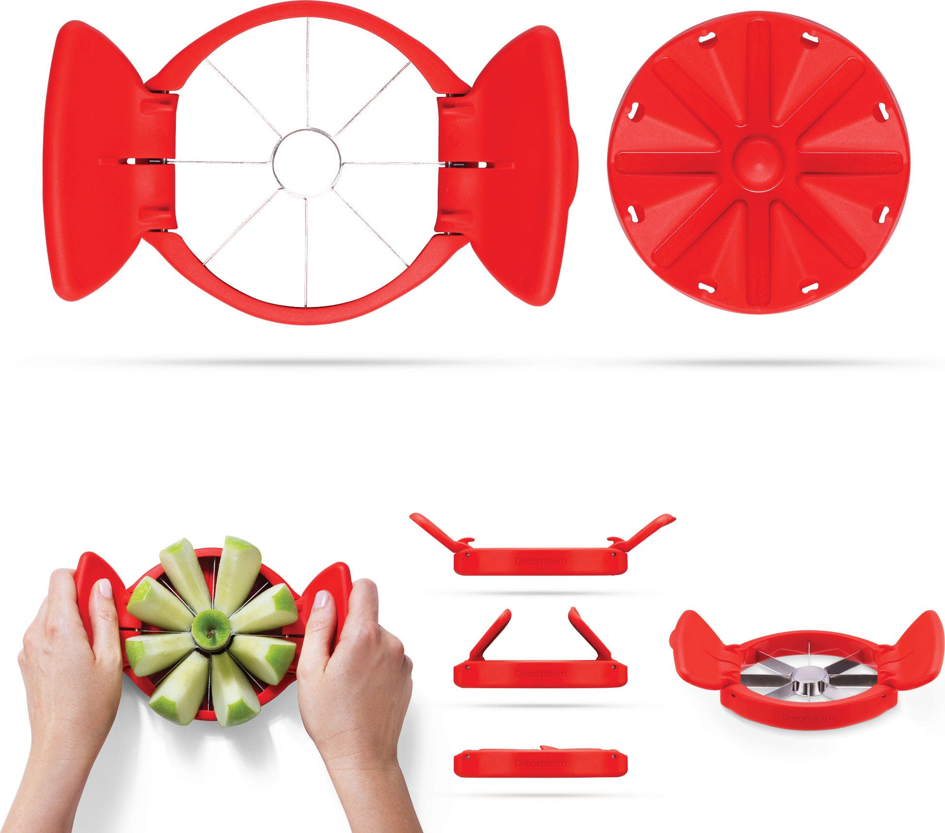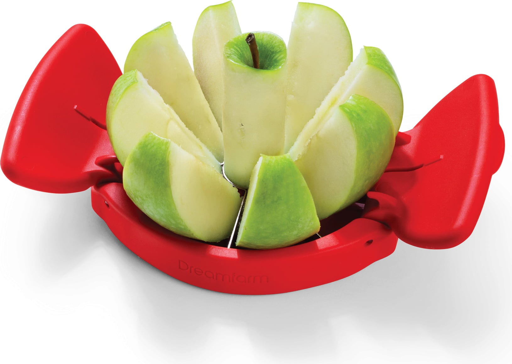 Con el cortador de manzanas Flapple de Dreamfarm puedes cortar manzanas de cualquier tamaño en ocho gajos uniformes con un solo movimiento, ¡mientras que el corazón se elimina de forma limpia! Gracias a su práctica base de apoyo, las afiladas cuchillas de acero inoxidable no entran en contacto con la encimera, por lo que ni siquiera necesitas una tabla de cortar.