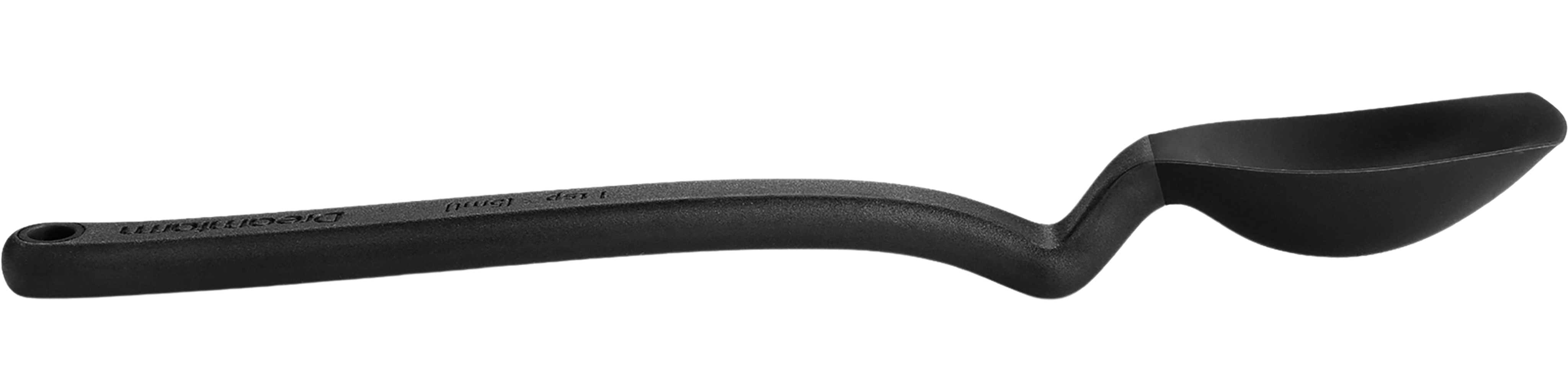 El pliegue integrado mantiene la cabeza de la cuchara siempre levantada de la superficie de trabajo, para que puedas apoyarla sin ensuciar. También puedes engancharla directamente al borde de la olla. Las unidades de medida integradas permiten dosificar con precisión 5 ml (una cucharadita), mientras que la Mini Supoon resiste temperaturas de hasta 260 °C.
