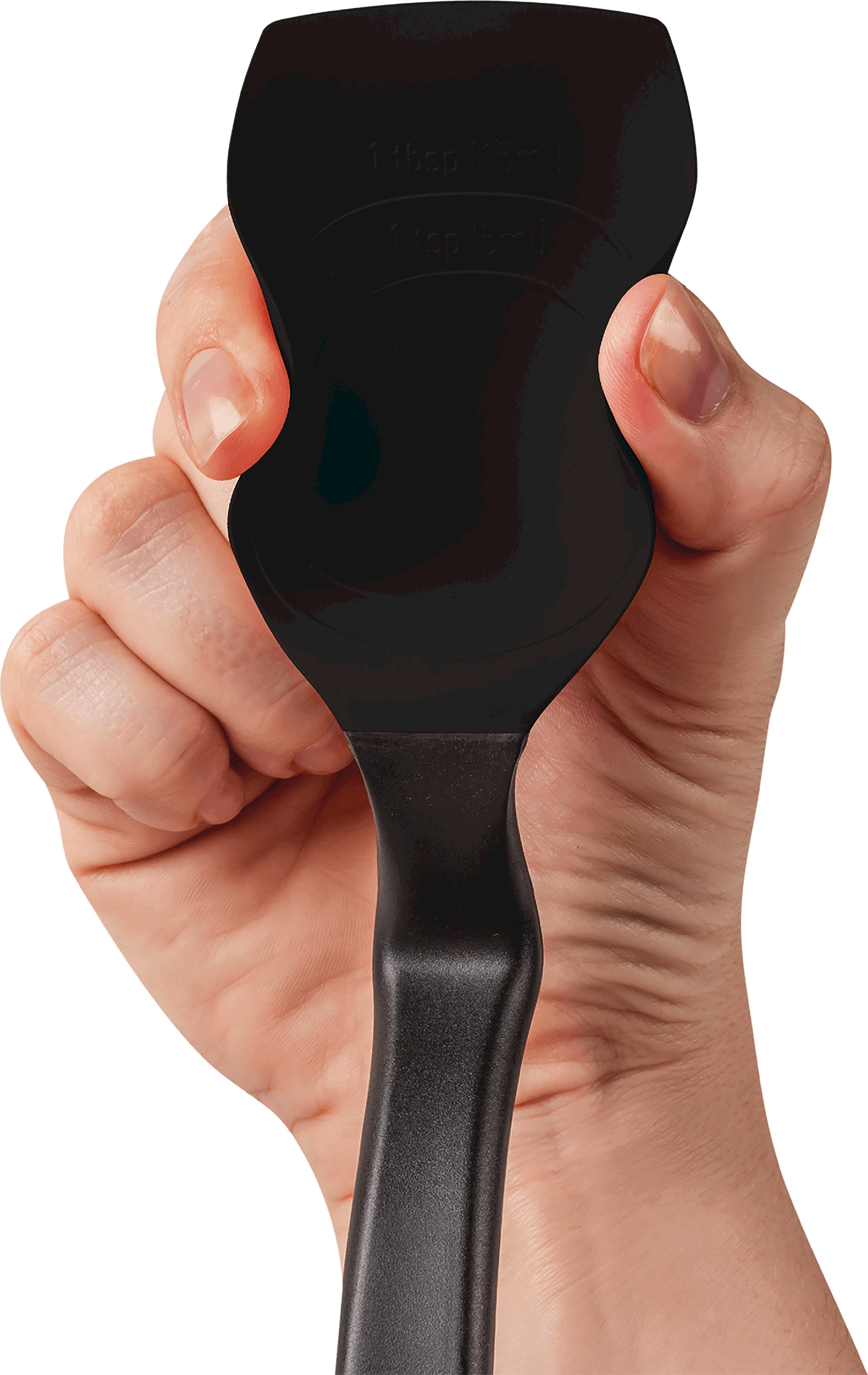 El pliegue integrado mantiene la cabeza de la cuchara siempre elevada sobre la superficie de trabajo, para que puedas apoyarla sin ensuciar. También puedes engancharla directamente al borde de la olla. Las unidades de medida integradas permiten dosificar con precisión 15 ml (una cucharada), mientras que la Supoon es resistente al calor hasta 260 °C.