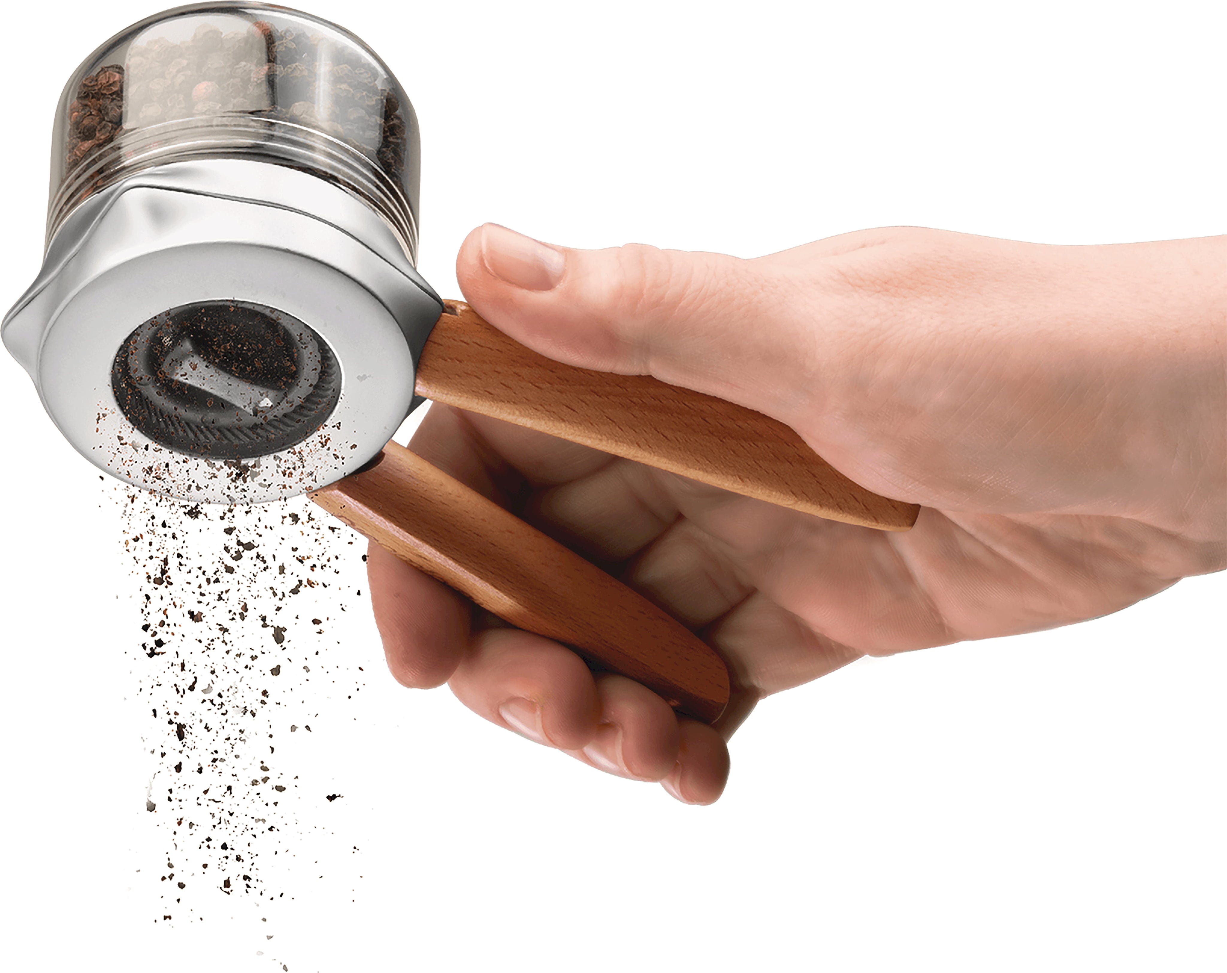 El mecanismo de molienda de cerámica ultraafilado es totalmente ajustable con 6 niveles, desde muy fino a grueso, no se oxida y es adecuado para casi todas las especias y semillas. Gracias a su diseño inclinado y al borde recogedor de migas, la superficie de trabajo permanece limpia cuando lo colocas sobre ella. Además, los mangos de madera de haya auténtica convierten a Ortwo en un elegante elemento de diseño en cualquier cocina.