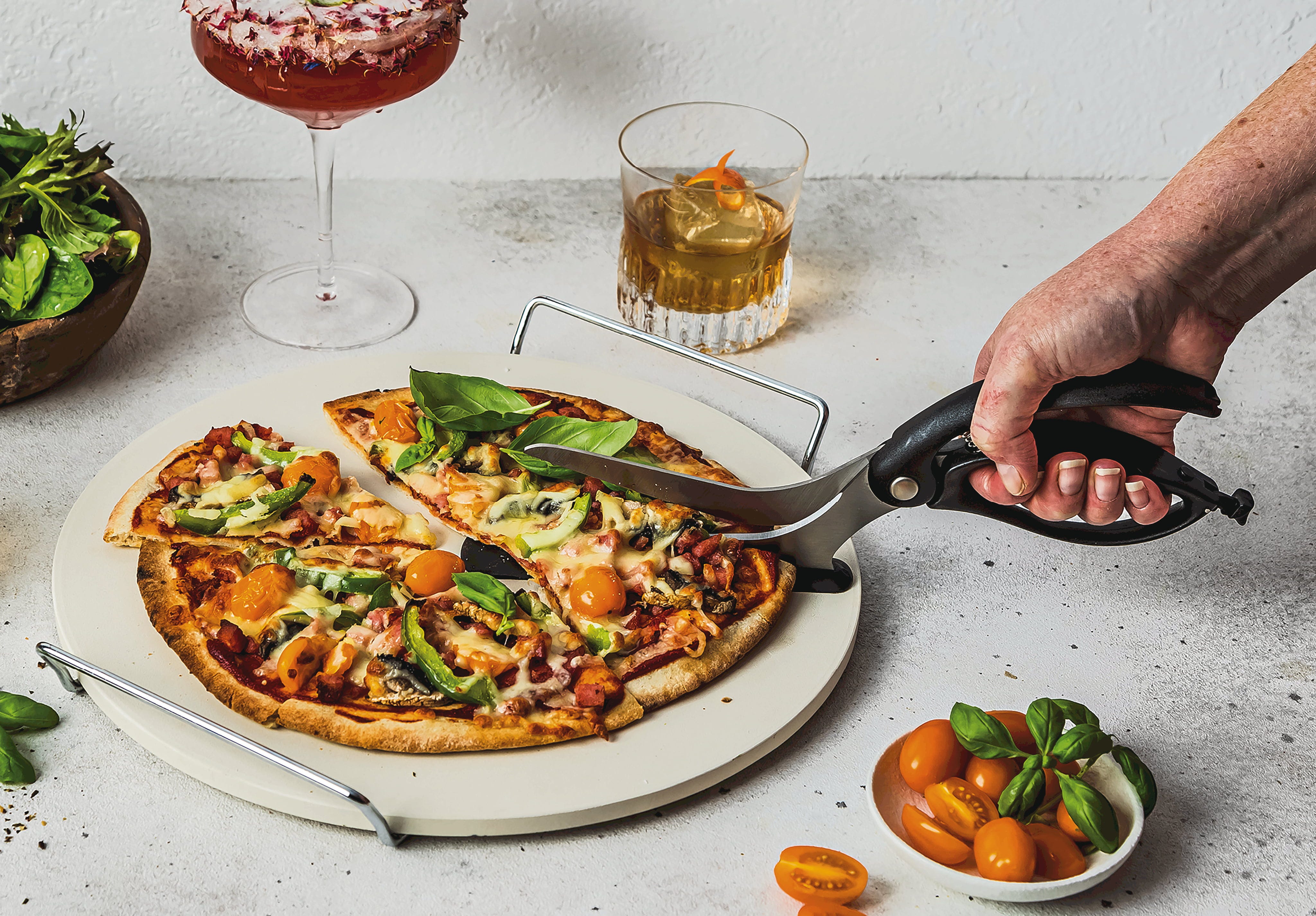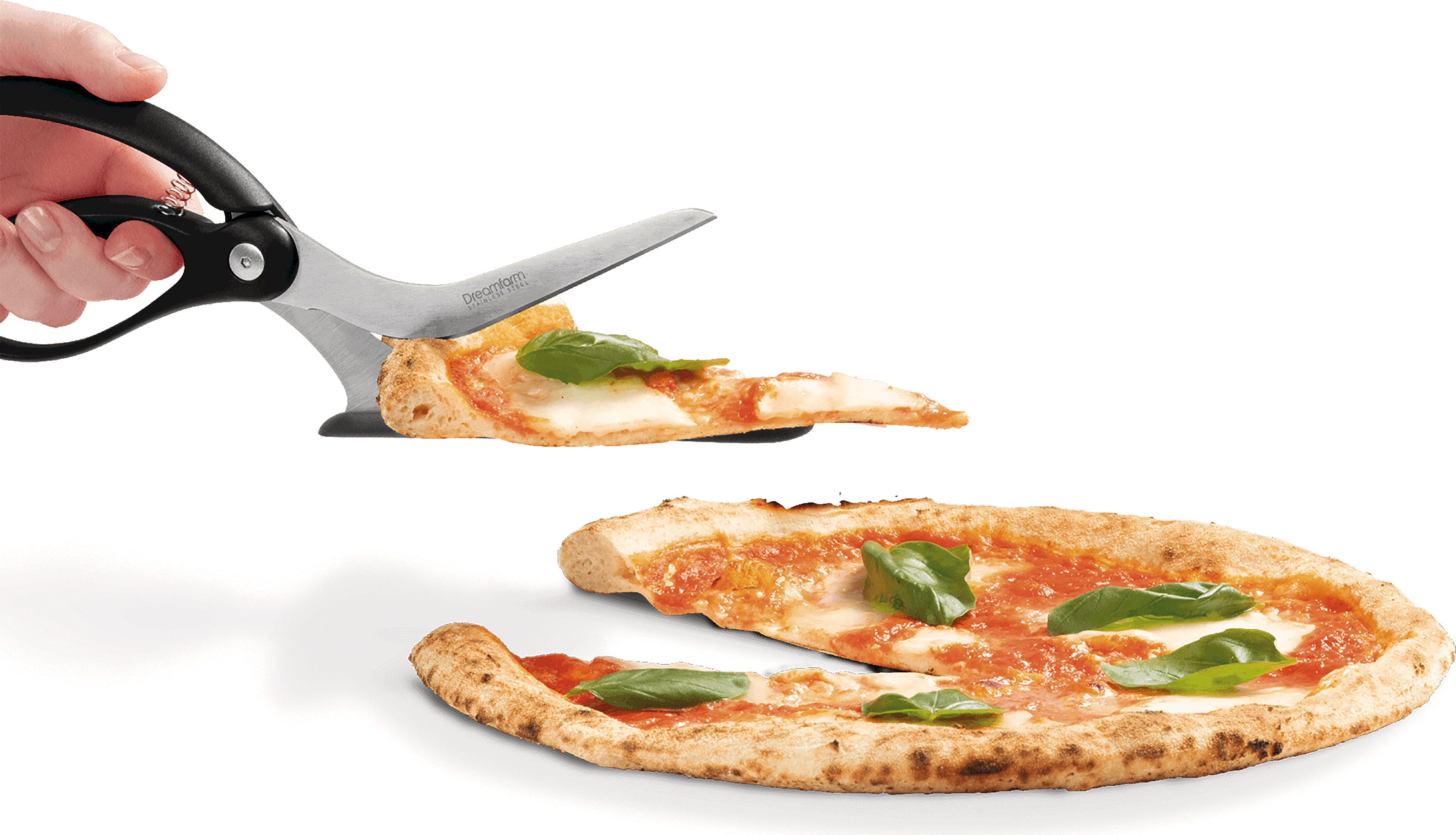 Olvida las ruedas cortapizzas poco afiladas que desplazan el condimento: con las tijeras para pizza Scizza de Dreamfarm, cortar la pizza es muy fácil. Estas innovadoras tijeras 2 en 1 combinan hojas extralargas de acero inoxidable alemán templado para un corte preciso con una práctica función de servicio.