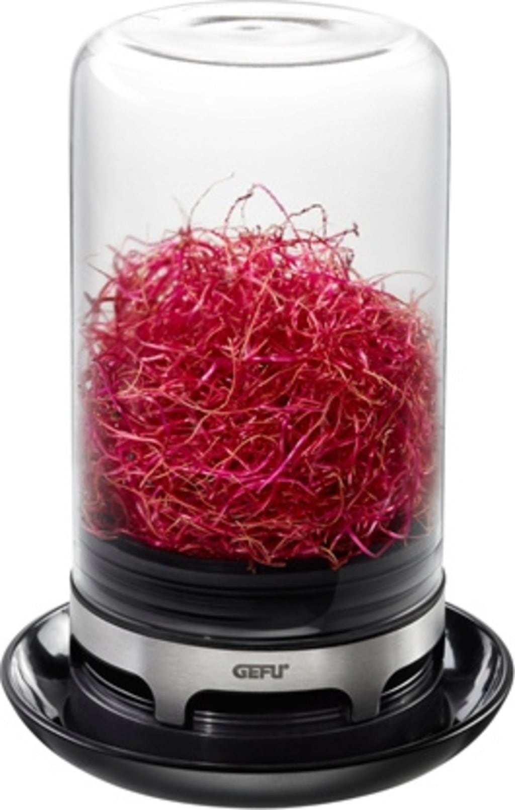 El sofisticado germinador BIVITA® de GEFU es un pequeño invernadero doméstico ideal para cultivar en casa germinados crujientes, ricos en minerales y fibra, perfectos para ensaladas, platos al wok o simplemente para picar La cúpula de robusto cristal de borosilicato garantiza unas condiciones óptimas de luz, mientras que la base de diseño inteligente crea el clima perfecto: la ventilación integrada garantiza un intercambio continuo de aire y mantiene frescas durante mucho tiempo las semillas germinadas, como alfalfa, judías mungo, rábanos o lentejas.