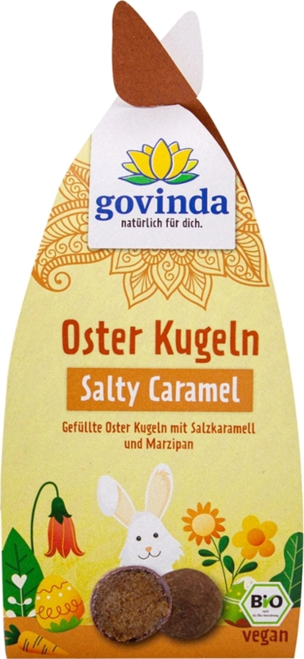 Las bolas de Pascua Salty Caramel de Govinda ofrecen una armoniosa combinación de dulce pasta de dátiles y un delicado toque de sal marina. El cremoso corazón de caramelo de dátiles está recubierto por una crujiente capa de chocolate. Estas bolas bio veganas se elaboran con cuidado en nuestra fábrica y son una alternativa de calidad para quienes aprecian la combinación de lo dulce y lo salado. Ideales como refinado complemento para la cesta de Pascua.