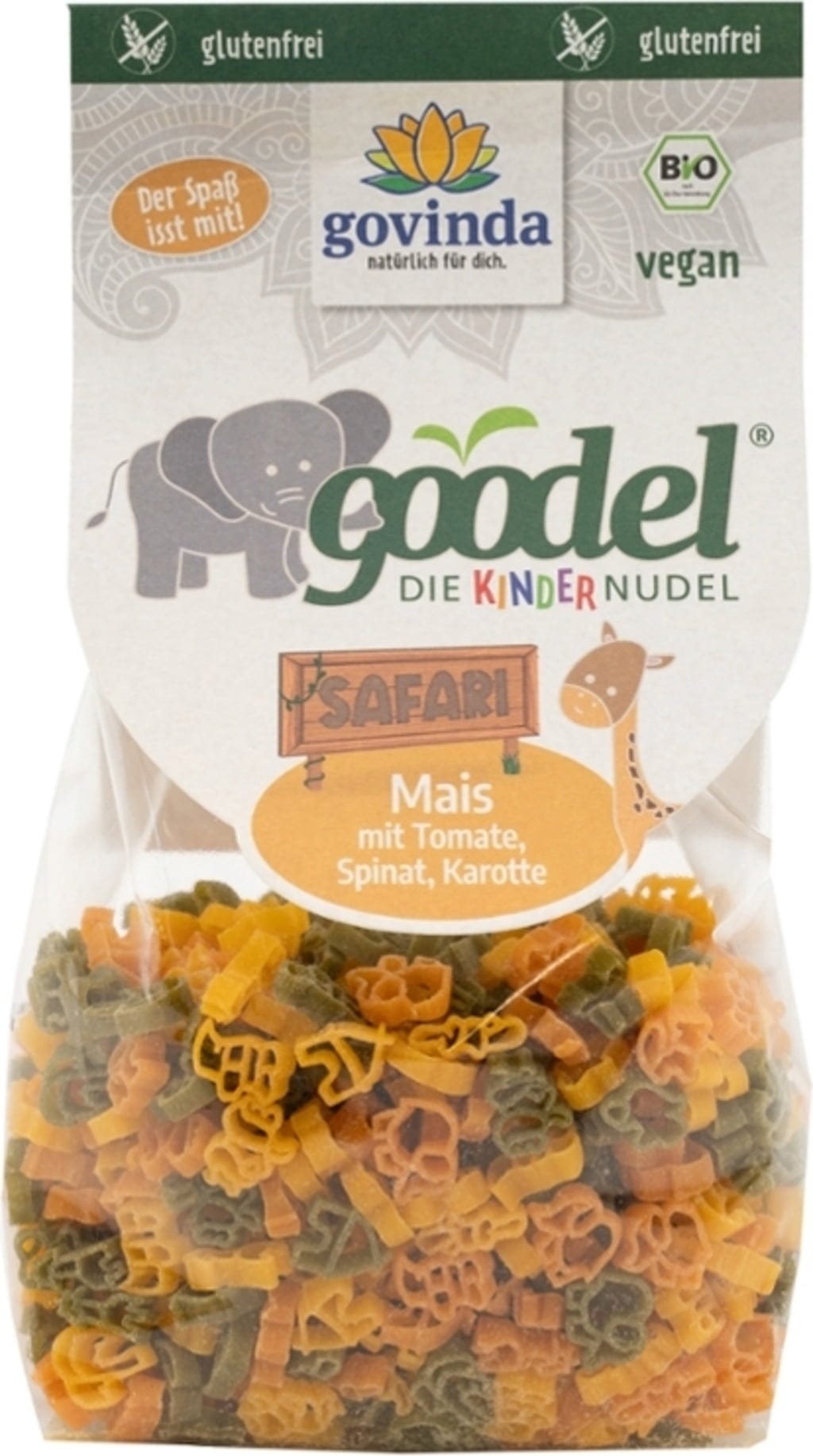 La pasta Kinder Goodel «Safari» de Govinda ofrece una divertida y colorida experiencia en el plato con formas de animales salvajes africanos. Producida en Italia, la delicada masa de maíz está enriquecida de forma natural con tomate, zanahoria y espinacas. Secada con cuidado, esta pasta no contiene gluten y se cocina bien. Una opción alegre y consciente para el plato de los niños, sin aditivos artificiales.