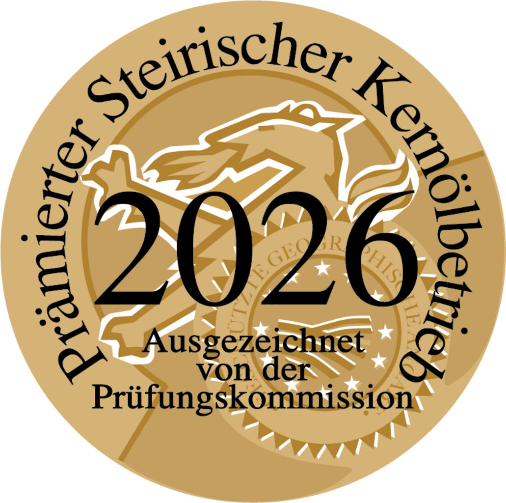 El exquisito aceite de semillas de calabaza de Estiria IGP. de primera presión suave de la granja Jöbstl se prensa fresco cada semana y es un producto puramente natural. Se conoce como el oro verde de Estiria.