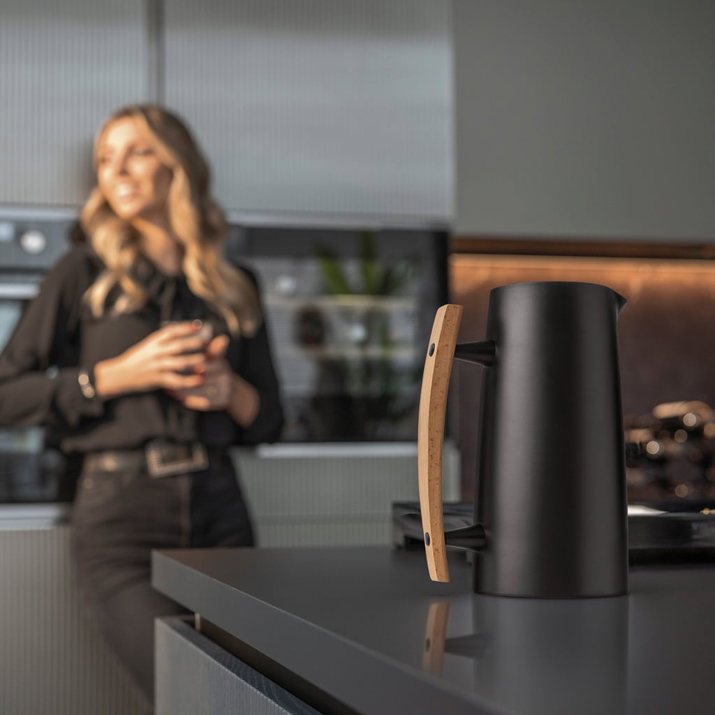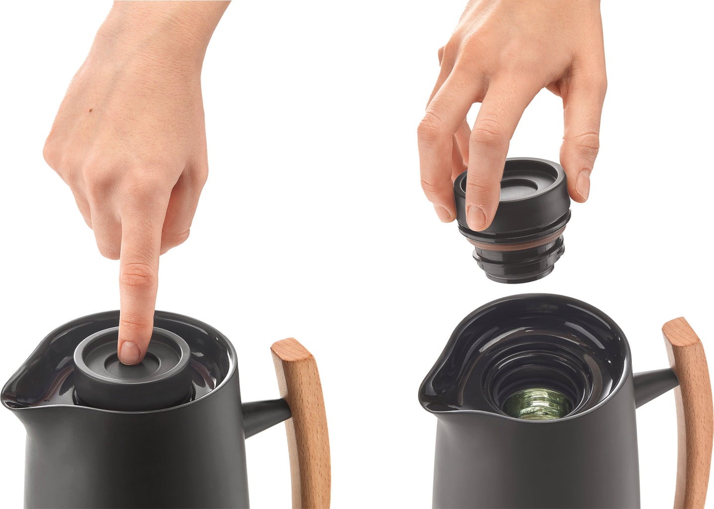 Gracias al práctico sistema push, la jarra se abre fácilmente y se cierra de forma segura. El cierre hermético evita cualquier derrame y conserva la temperatura de forma óptima. La amplia boca facilita y agiliza el llenado, mientras que el elegante asa de madera, además de ser estéticamente refinada, ofrece un agarre cómodo y agradable. Con una capacidad de 1 litro, Riviera '63 es la compañera ideal para todos los días y para todas las ocasiones.