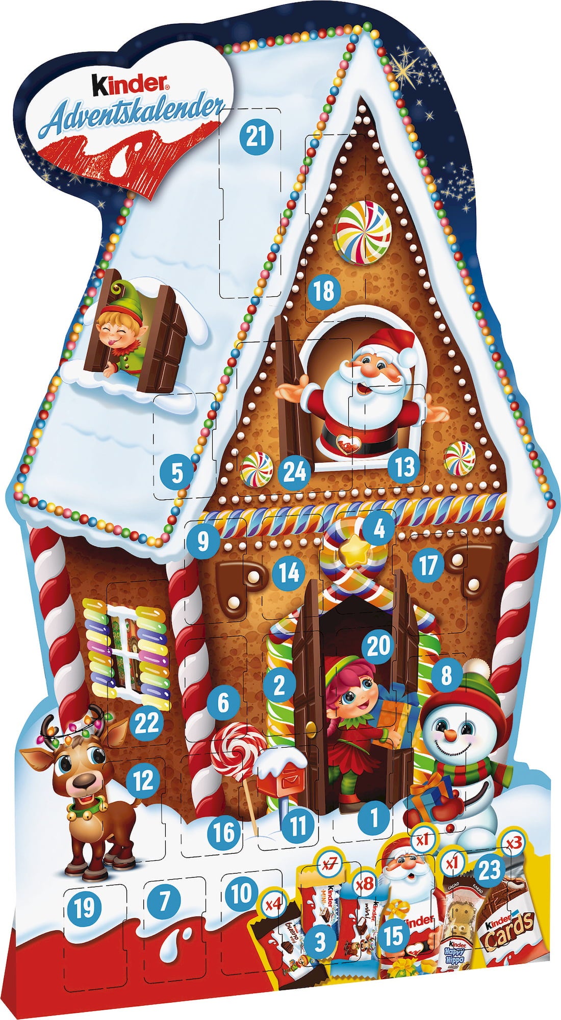 ¡Las mejores variedades Kinder Ferrero te esperan detrás de 24 ventanitas! Un total de 6 variedades endulzan la espera de la Navidad de niños y golosos.