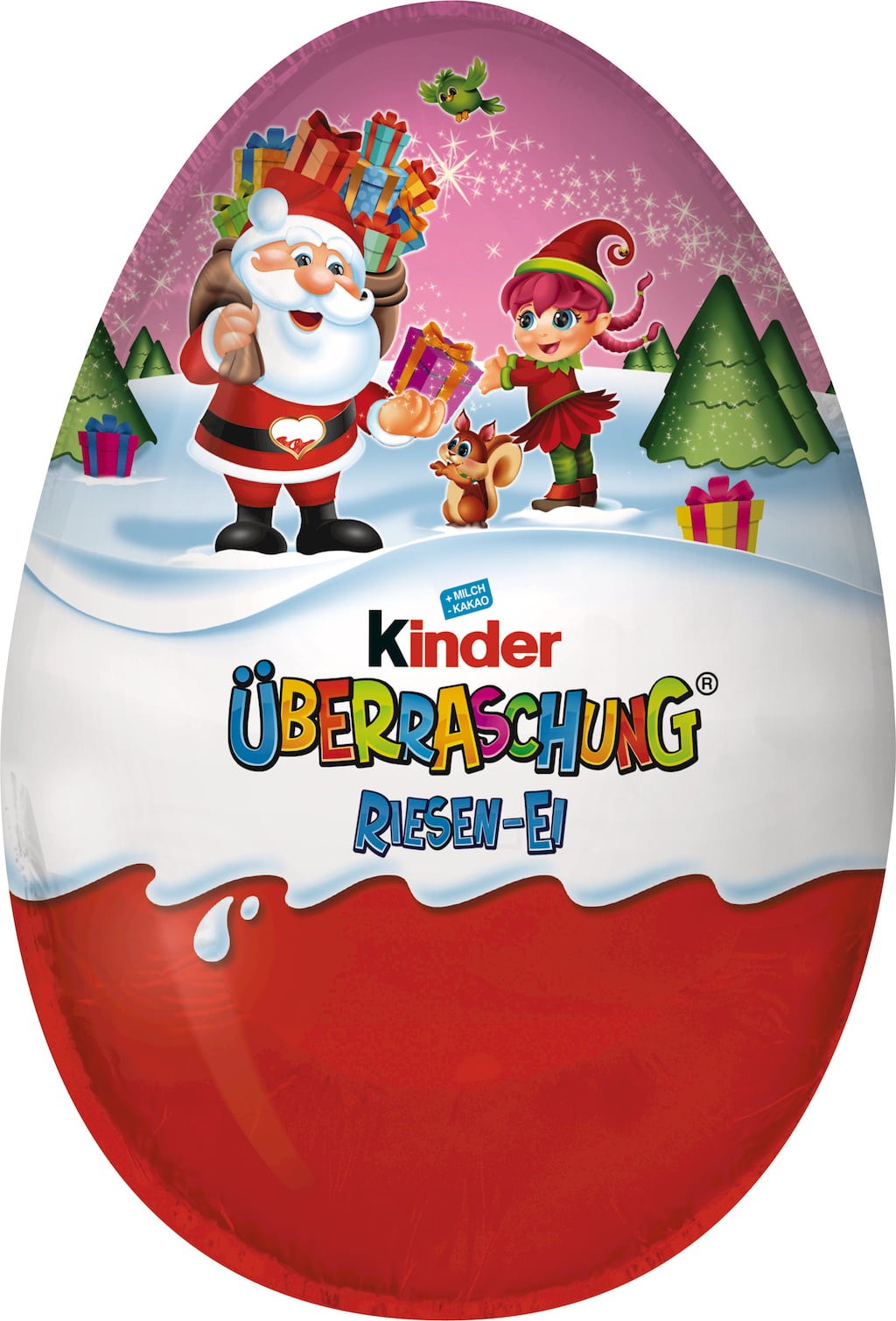 Un clásico en el universo de los dulces: el aromático chocolate con leche con glaseado de chocolate blanco que incluye una sorpresa en su interior. El huevo gigante es más grande que la versión convencional y tiene una fantástica decoración navideña.