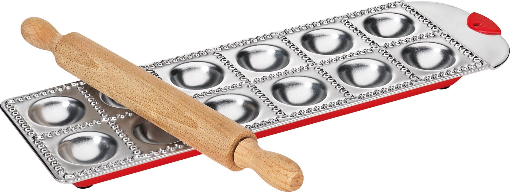 Fácil de usar: extiende la masa fina, espolvorea con harina y colócala sobre la mesa. Presiona la masa en los huecos y añade el relleno. Pincela los bordes con yema de huevo batida, cubre con una segunda lámina de masa y pasa suavemente el rodillo. Saca los raviolis del molde y proceda a cocinarlos.
