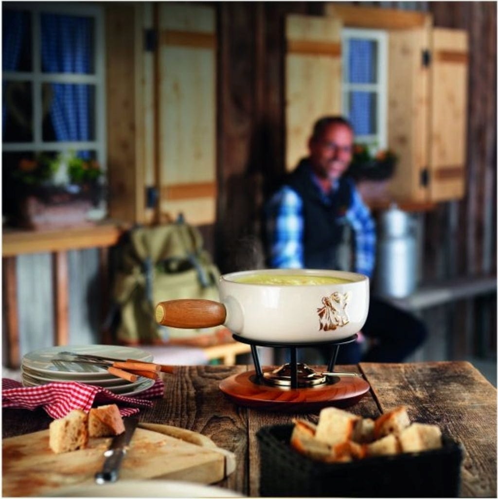 Junto con el caquelón, el rechaud se usa para hacer fondues de queso y carne, para mantener la comida caliente. El accesorio cuenta con una base de madera de cerezo y un quemador en tonos dorados.