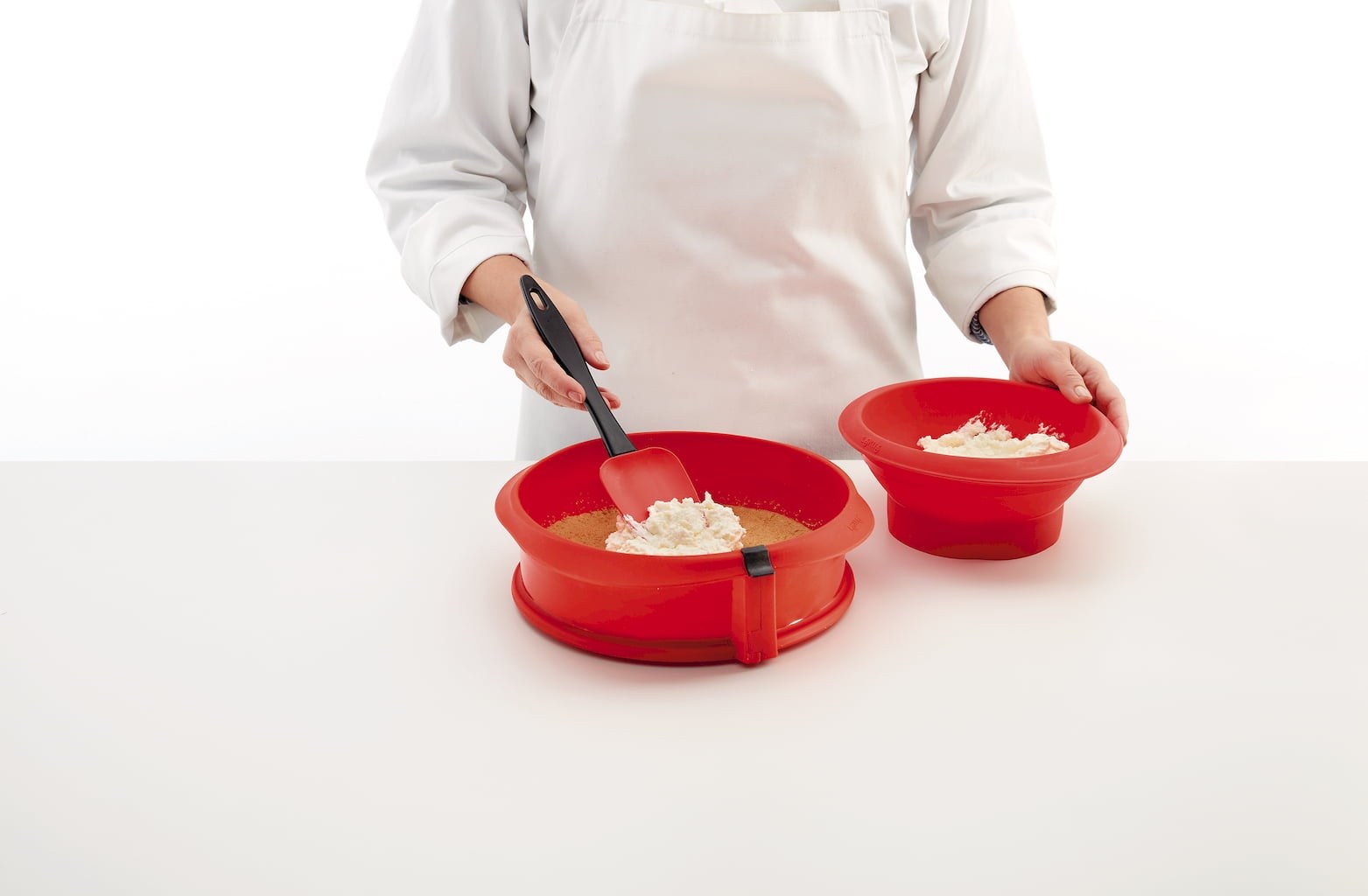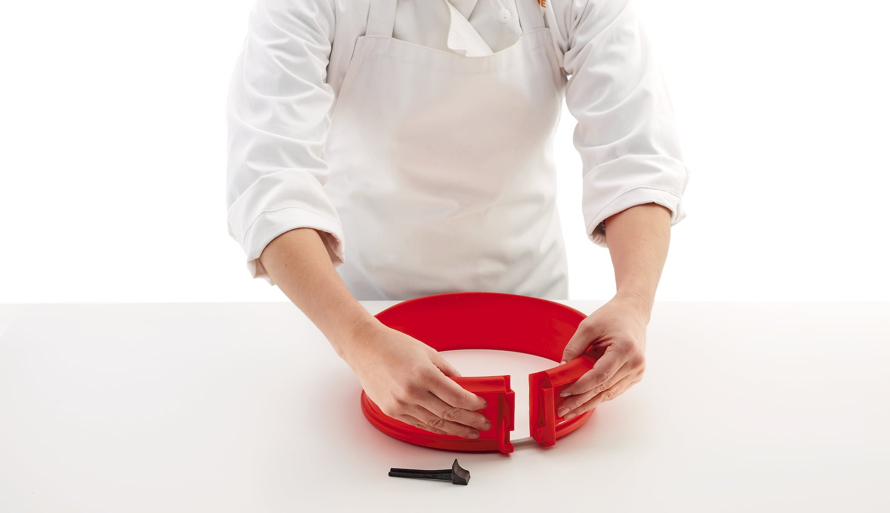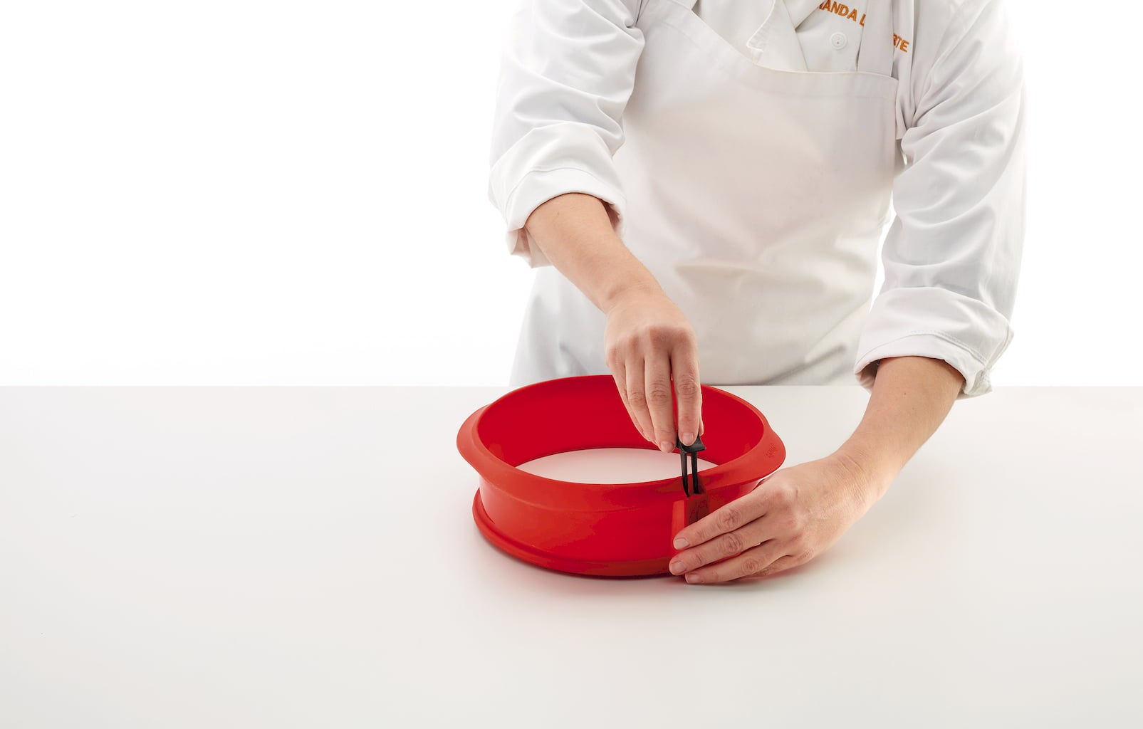 El truco de este molde es la combinación de un anillo flexible de silicona antiadherente y una base robusta de cerámica. Gracias al ingenioso sistema de cierre con clip, el anillo se cierra fácil y firmemente alrededor del plato, evitando que se derrame durante la cocción. Después de hornear, abre el cierre sin esfuerzo, el anillo se separa suavemente del pastel y tu obra maestra está perfectamente desmoldada y lista para servir en el elegante plato de cerámica resistente a los arañazos y al calor.