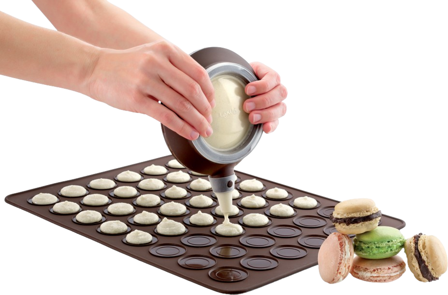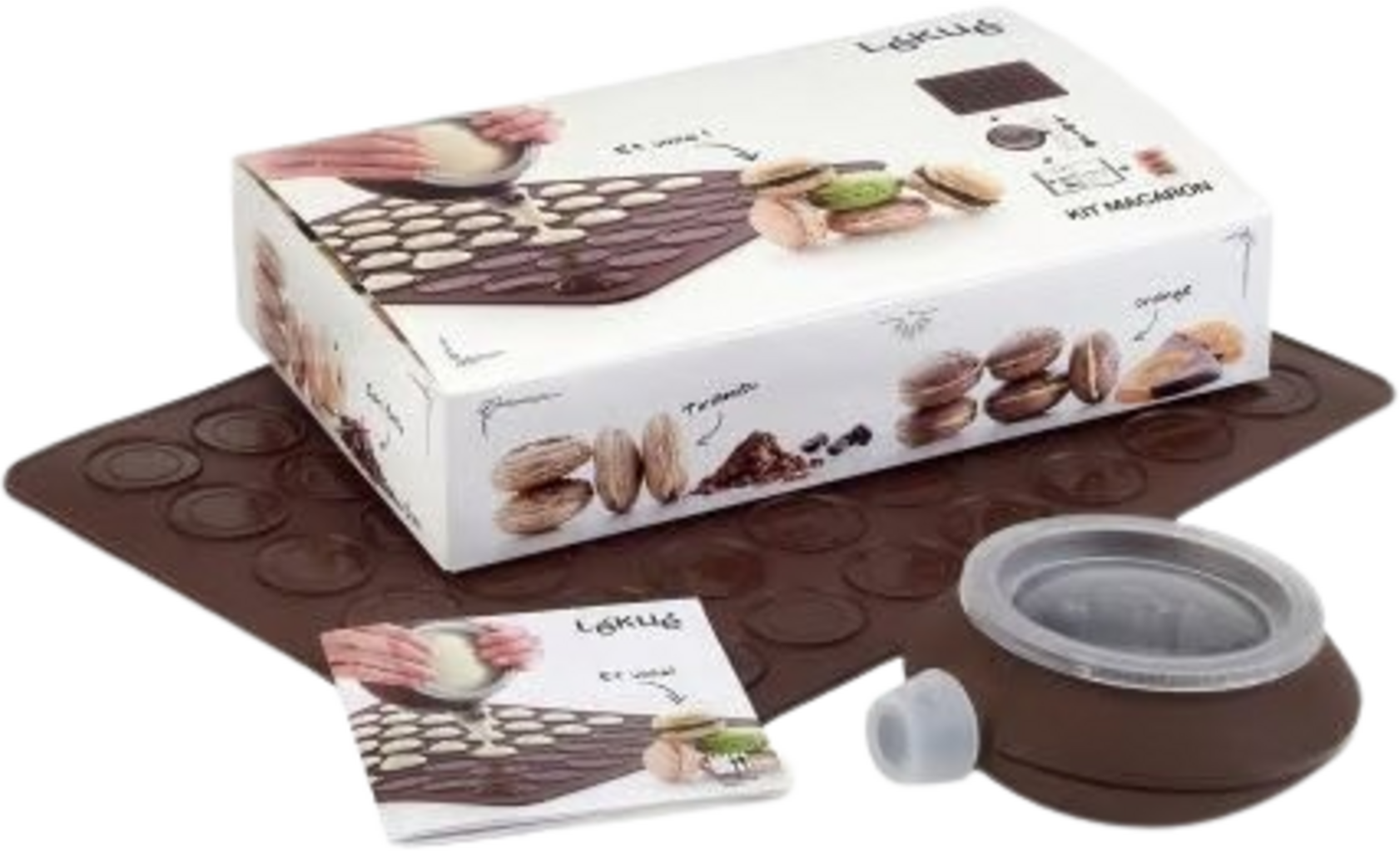 ¿Sueñas con preparar tus propios macarons deliciosos y perfectos cada vez? ¡Con este set para macarons, tu sueño se hace realidad! El corazón del set es la esterilla de silicona 100 % platino de alta calidad especial para hornear macarons. Para rociar con precisión la masa y rellenar artísticamente tus creaciones, el Decomax incluido con sus seis puntas diferentes es tu compañero ideal.