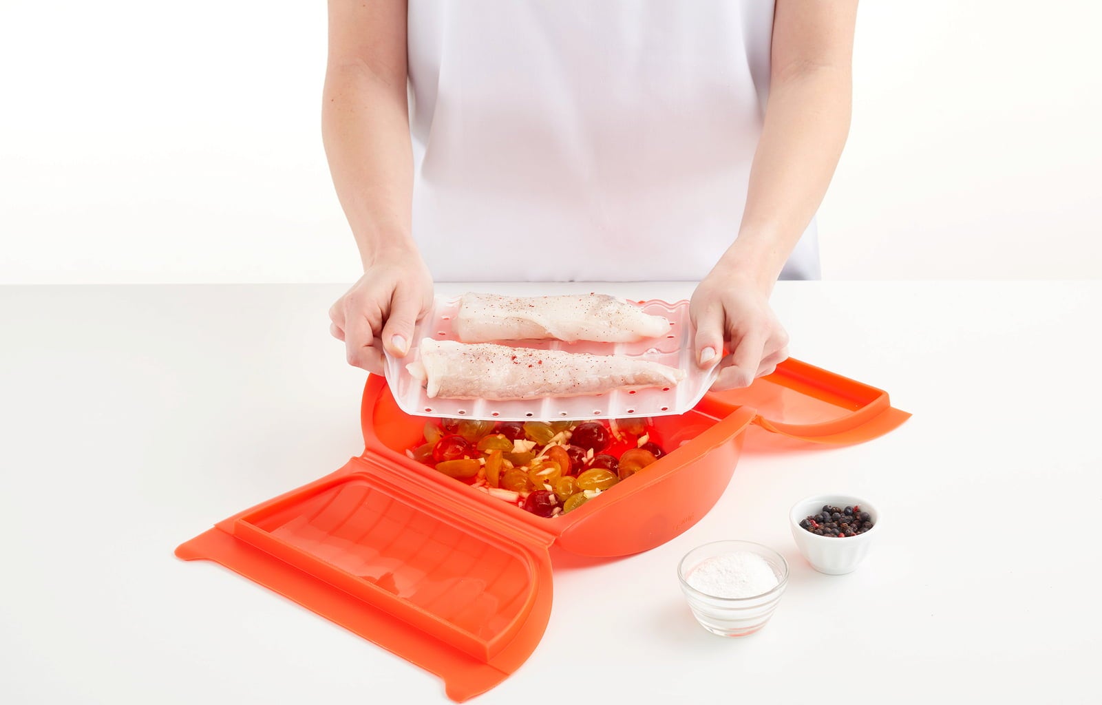 Fabricada 100 % en silicona platino de alta calidad, esta ligera vaporera no contiene BPA y garantiza un manejo sencillo y cómodo en cada uso. ¡Descubre lo fácil y rápido que es preparar comidas sabrosas y variadas para ti y los tuyos!