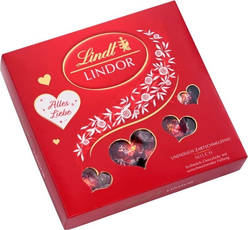 Con los bombones Lindor de Lindt, cada momento se convierte en un momento especial. Cuando la fina cáscara de chocolate se rompe, el suave relleno de chocolate negro con leche estalla y deleita el paladar. La caja con ventana en forma de corazón convierte a estos pralinés en una idea de regalo ideal para San Valentín.