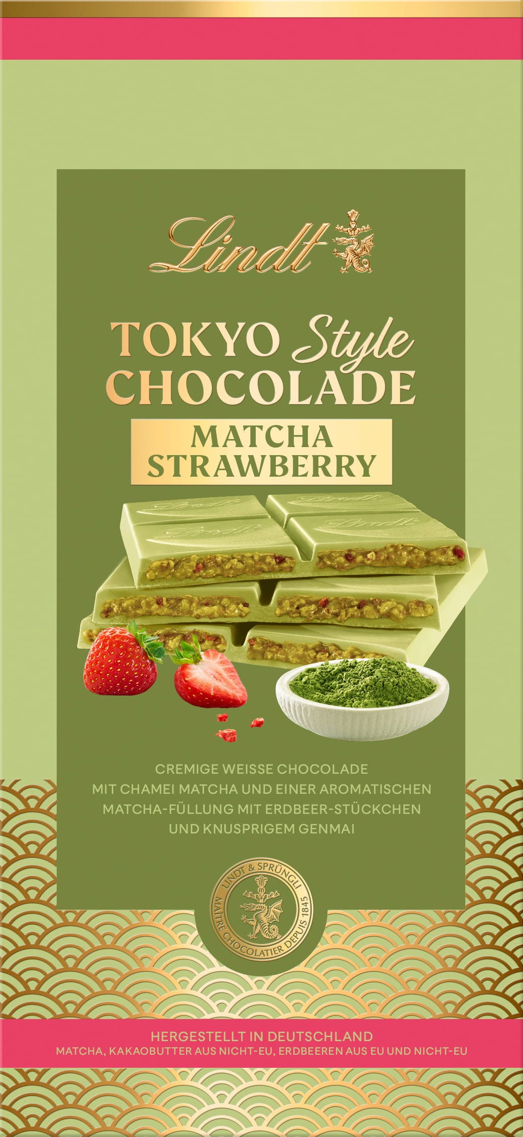 Inspirada en la calma de las ceremonias japonesas del té y en el deseo de momentos de conciencia, esta tableta combina el cremoso chocolate blanco Lindt con matcha. La creación cautiva con un aromático relleno de matcha enriquecido con notas afrutadas de fresa.