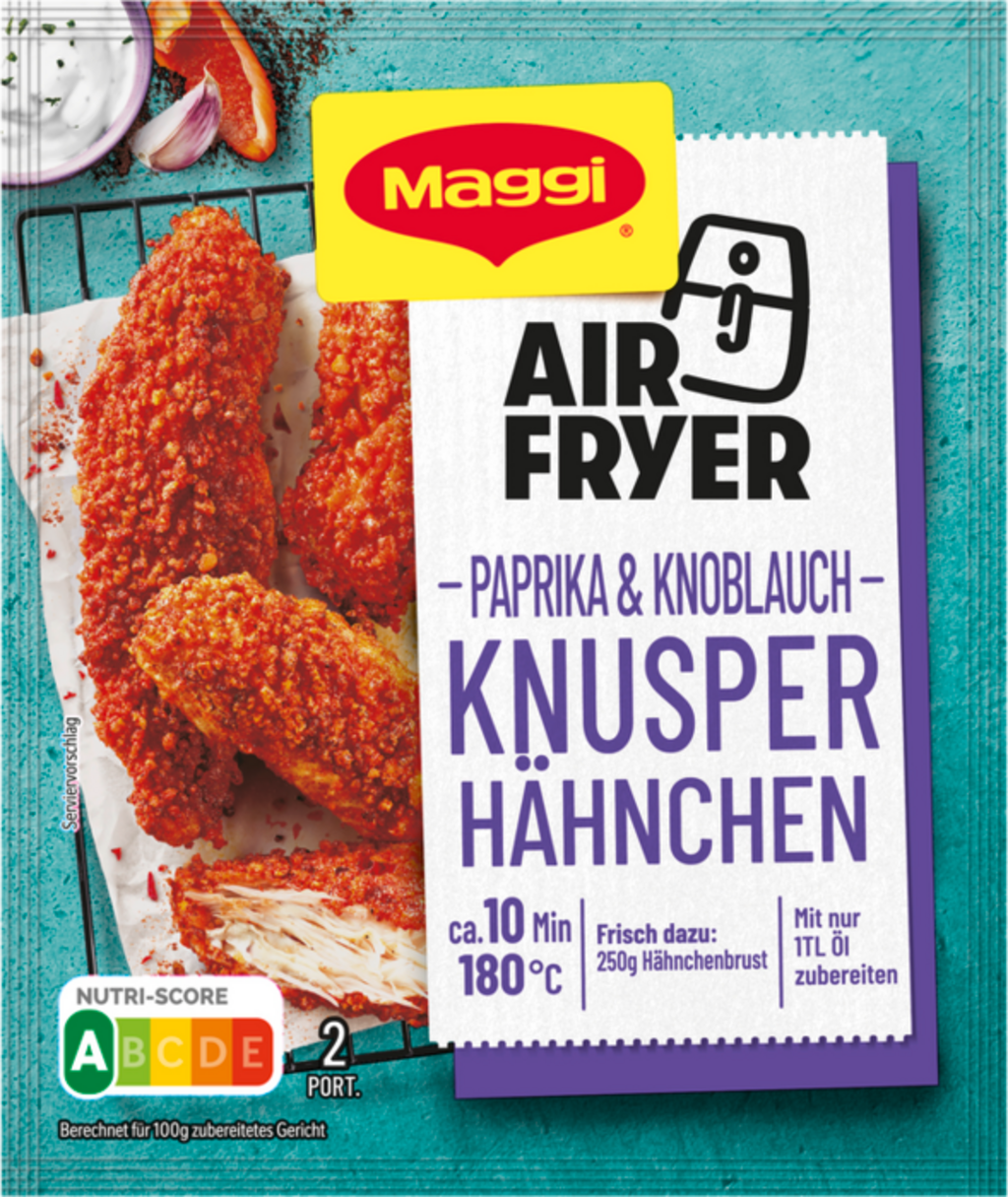 Con la Air Fryer - Crispy Chicken Paprika and Garlic mixture de Maggi transformarás la pechuga de pollo en un plato aromático y crujiente. La mezcla, desarrollada para la freidora de aire, proporciona un dorado uniforme y una textura crujiente por fuera, al tiempo que mantiene la carne tierna por dentro. Con sólo una cucharadita de aceite y unos pocos ingredientes frescos, obtendrás un plato lleno de sabor en un abrir y cerrar de ojos.