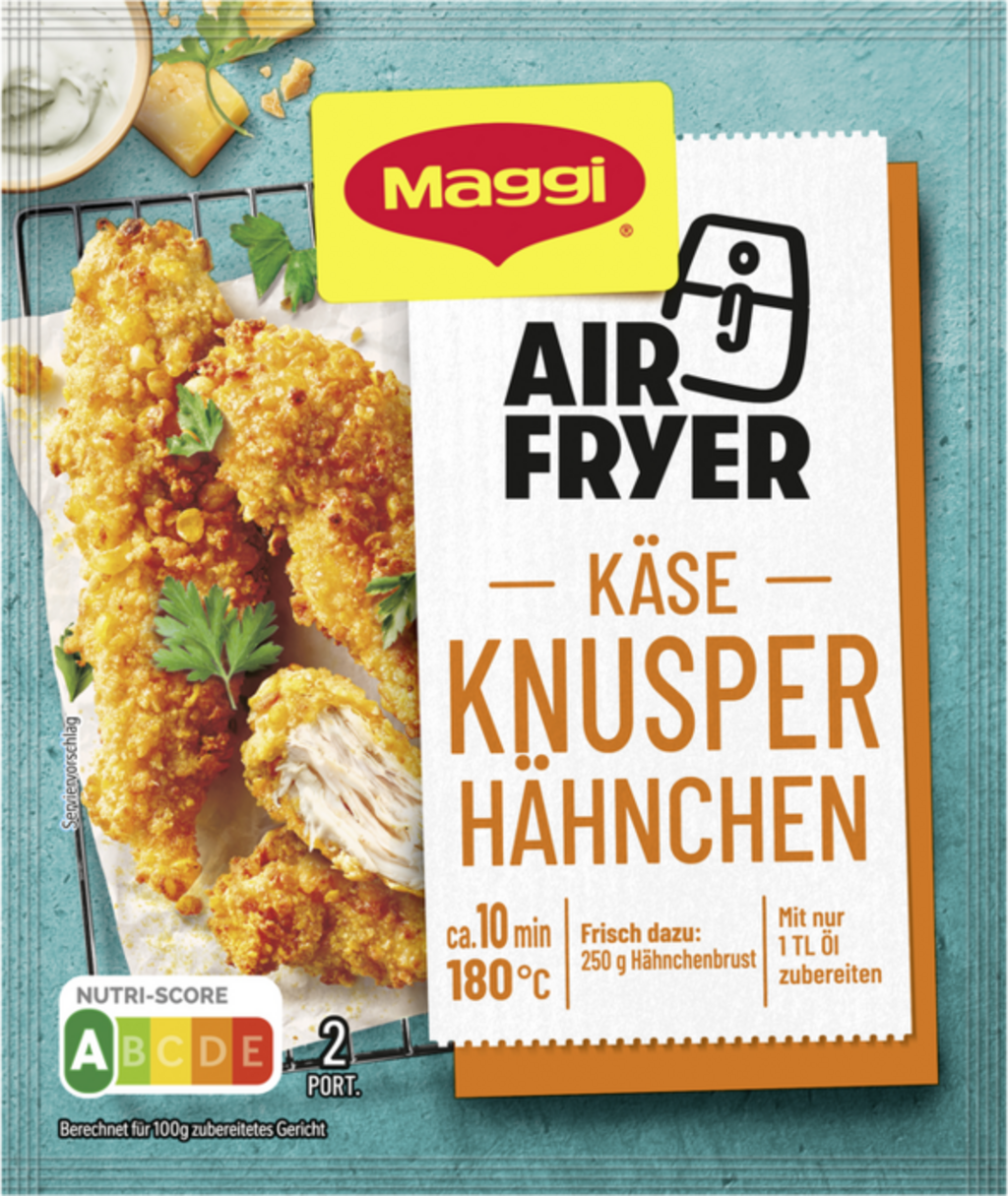 La mezcla Maggi's Air Fryer - Pollo Crujiente con Queso transforma la pechuga de pollo en un plato aromático e irresistiblemente crujiente. La mezcla, diseñada para la freidora de aire, garantiza un exterior dorado y crujiente y un interior suave, sin necesidad de freír. Con sólo una cucharadita de aceite y unos pocos ingredientes frescos podrá preparar un sabroso plato en cuestión de minutos.