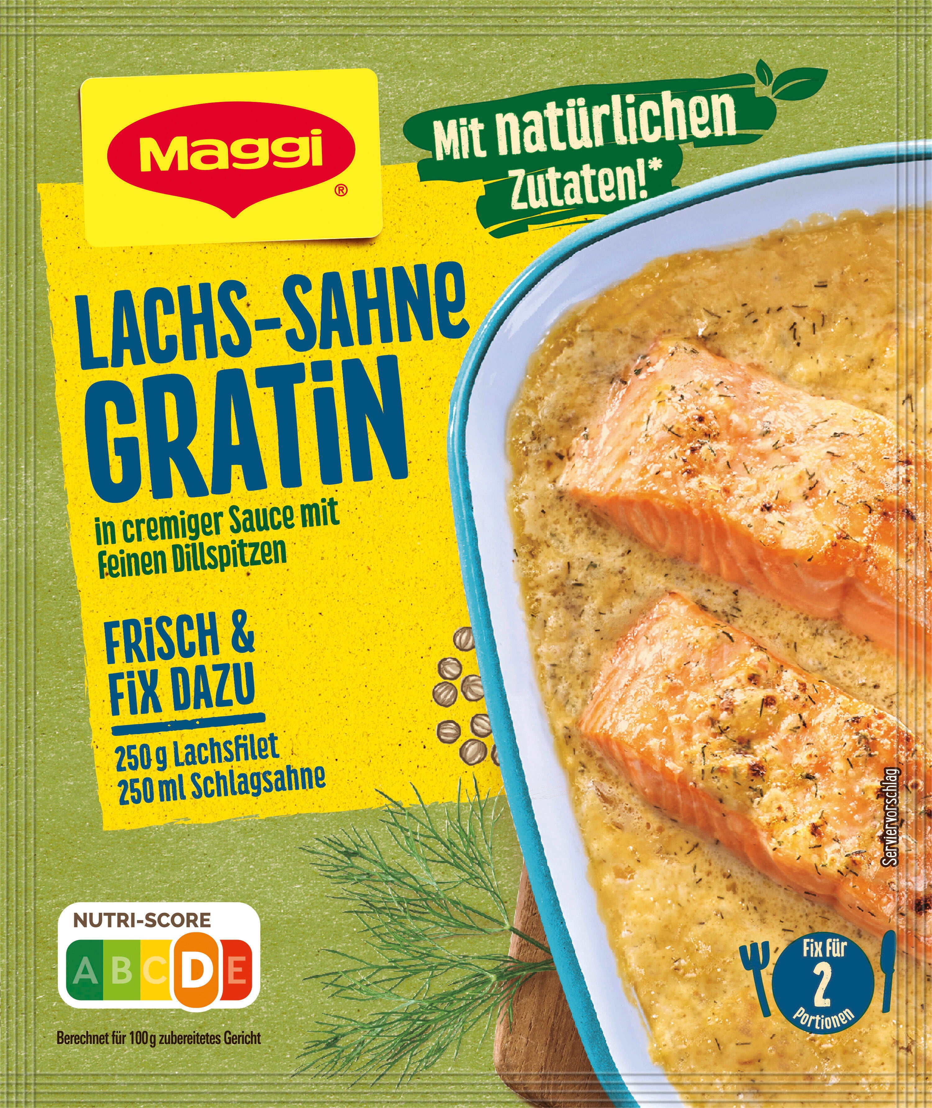 Rápido, cremoso y lleno de sabor: con Maggi's Fix - Salmón gratinado con nata prepararás sin esfuerzo un delicioso plato de pescado para toda la familia. La nota de eneldo fresco da al gratinado un aroma ligero y agradablemente fragante. Ideal con arroz, patatas cocidas o una ensalada crujiente.