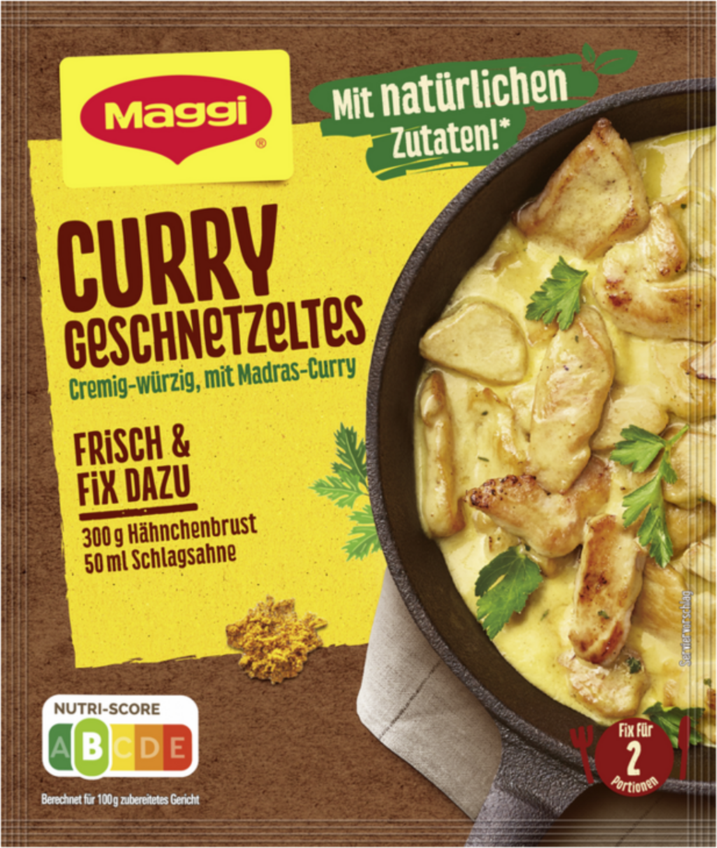 Idea de receta para 2-3 raciones: dorar 300 g de pechuga de pollo, añadir 50 g de nata y la mezcla de curry y cocer brevemente para obtener un plato cremoso y rico en sabor.