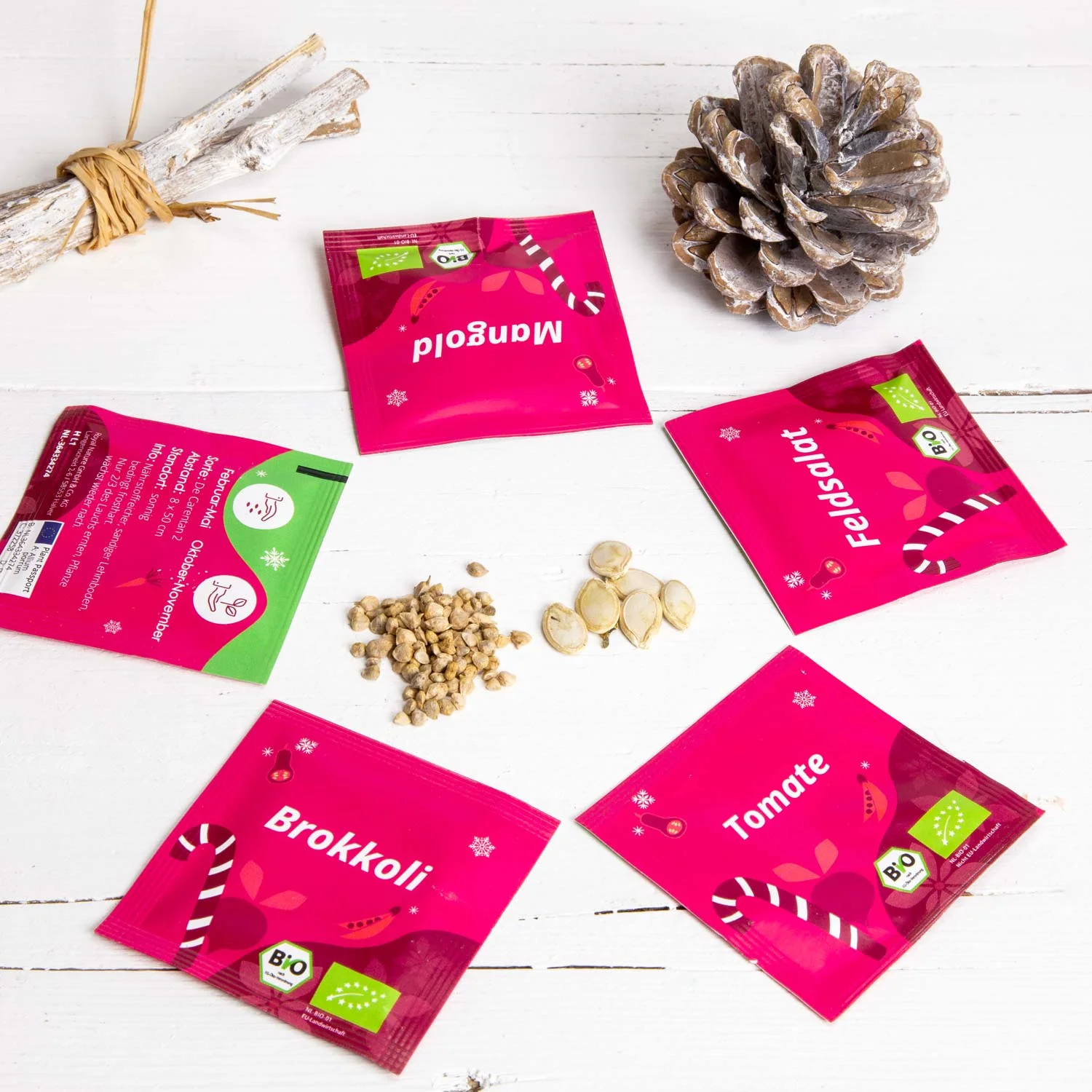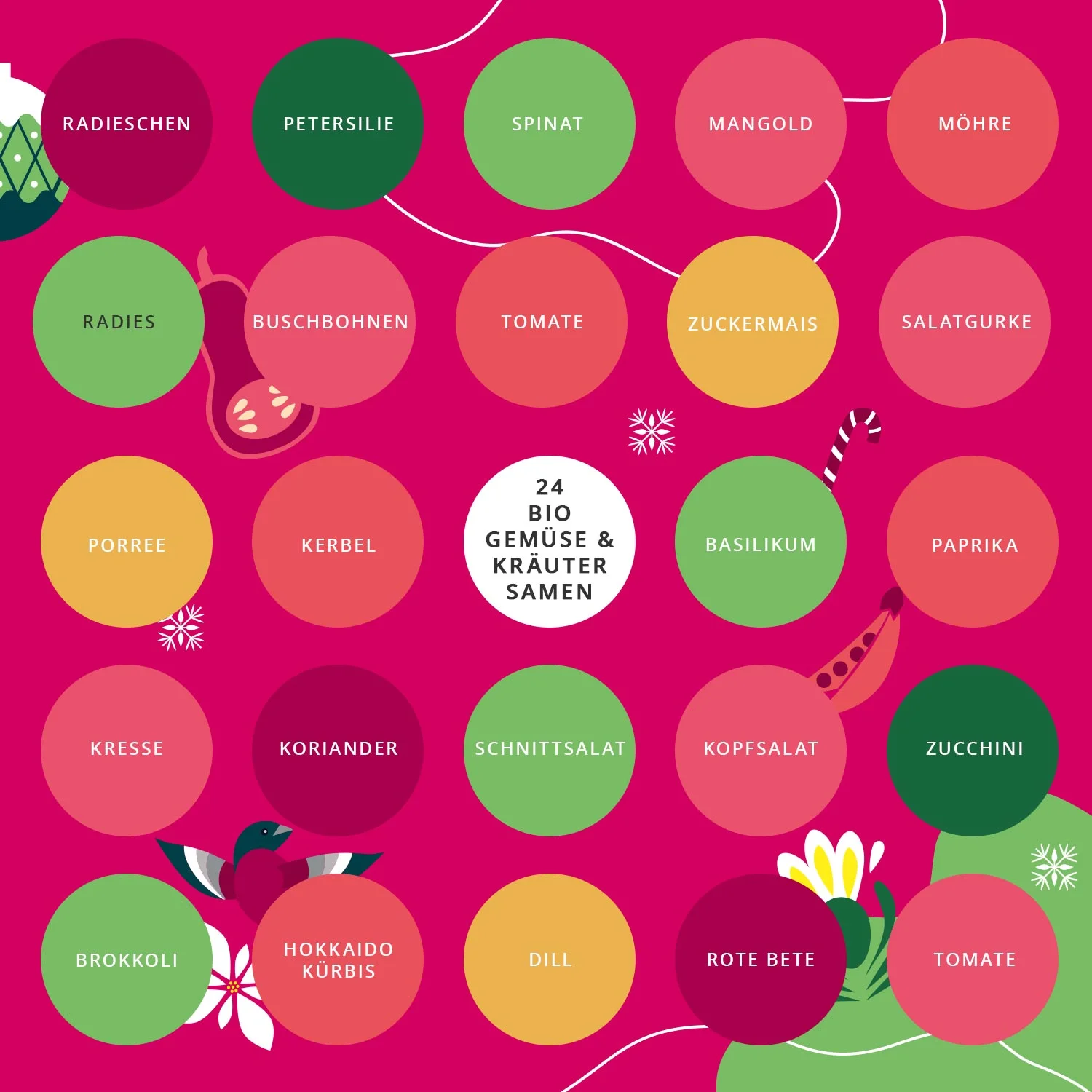 El calendario de adviento contiene 24 tipos diferentes de semillas ecológicas de hortalizas y hierbas que también pueden cultivarse en jardines pequeños y ofrece una gran variedad para arriates, huertos elevadas, balcones o patios. Además, las semillas están libres de ingeniería genética, tienen un alto poder germinativo y son resistentes a las semillas.