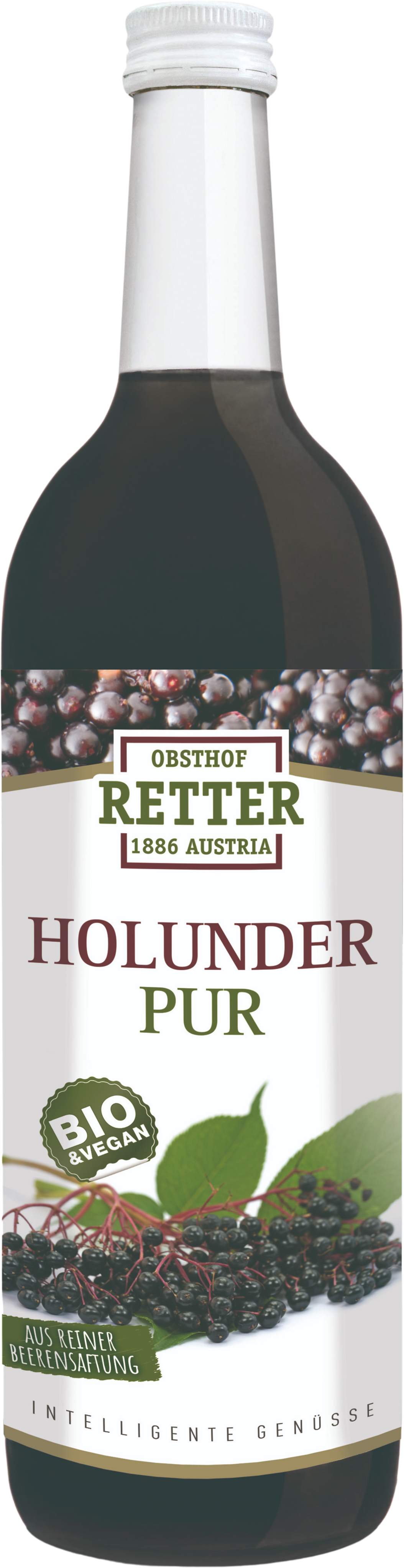 Las bayas de saúco negro maduran entre agosto y septiembre y no son aptas para el consumo en crudo. Sin embargo, el zumo de saúco ecológico de Obsthof Retter ofrece un agradable toque afrutado en pocos instantes. Es naturalmente rico en vitamina C y del grupo B y no contiene aromas artificiales, colorantes ni conservantes.