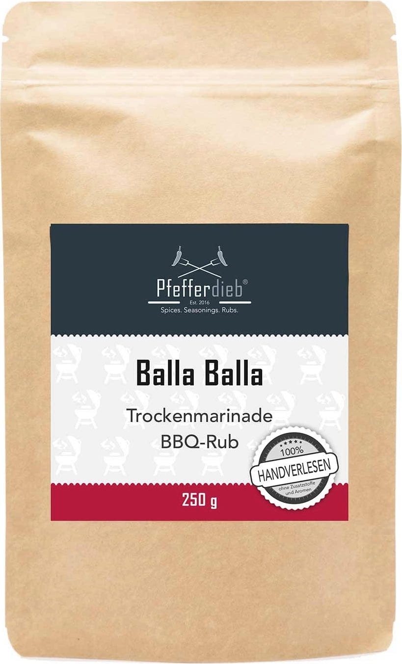 ¿Buscas el condimento adecuado para cerdo, cordero y pescado? Con la mezcla de especias para barbacoa Balla Balla de Pfefferdieb, tu próxima barbacoa será todo un éxito La sal marina, el romero, la salvia, el orégano y muchos otros ingredientes transportarán sus papilas gustativas en un viaje culinario al Mediterráneo.