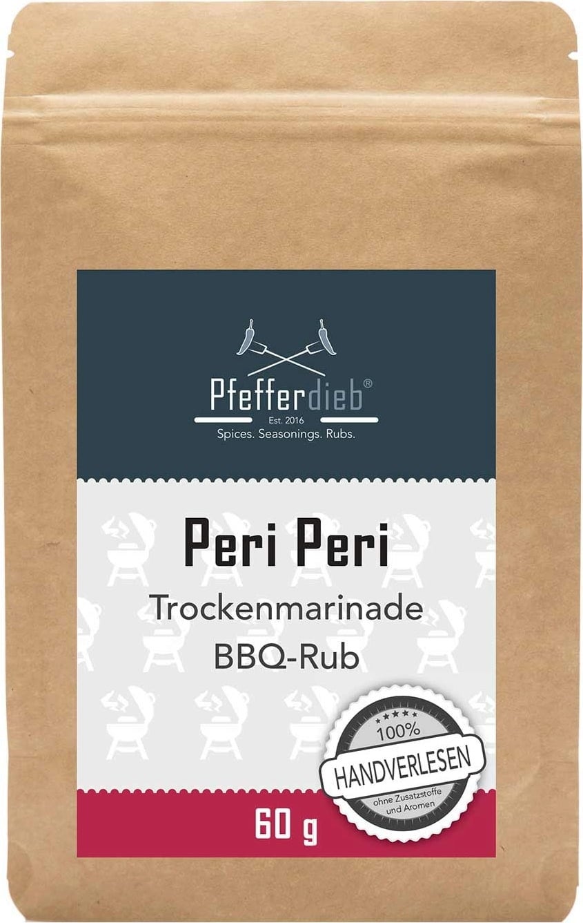 La mezcla de especias Peri Peri es un tributo al poder puro del sabor: rojo brillante, profundamente ahumado y con un picante intenso que realza los sabores sin abrumar. Inicialmente, se percibe un ligero calor subyacente, seguido de la nota ardiente del piri-piri. Al final, un ligero cosquilleo persiste en el paladar, aumentando la expectación por el siguiente bocado. El sabor se completa con deliciosas notas de ajo, cebolla, perejil y mucho más.