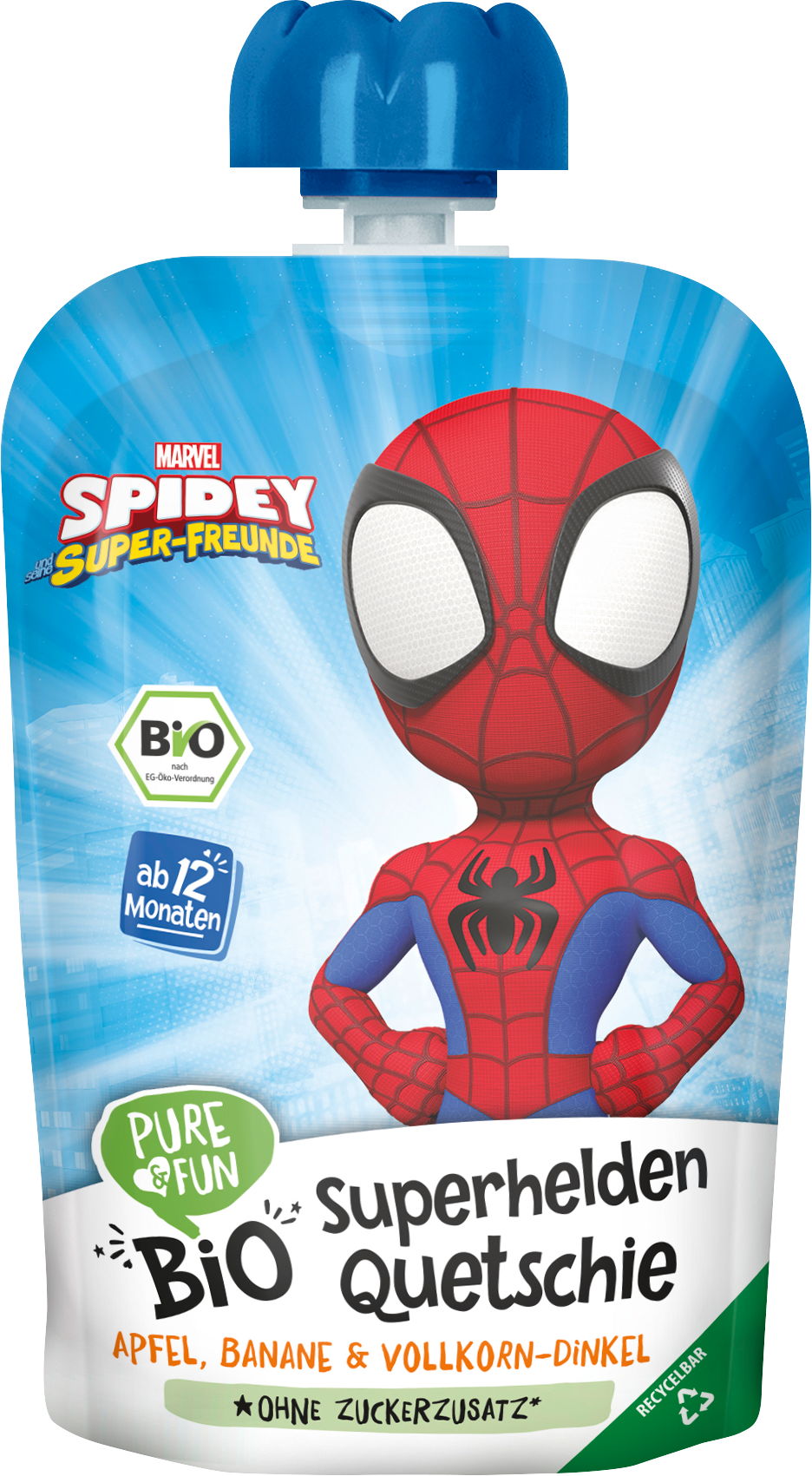 Los pequeños superhéroes necesitan un chute de energía de vez en cuando Esta mezcla afrutada con manzana, plátano y avena integral les da la energía que necesitan para vivir grandes aventuras. El simpático motivo de araña y superhéroe hace que este snack ecológico sea aún más divertido, sin azúcares añadidos.