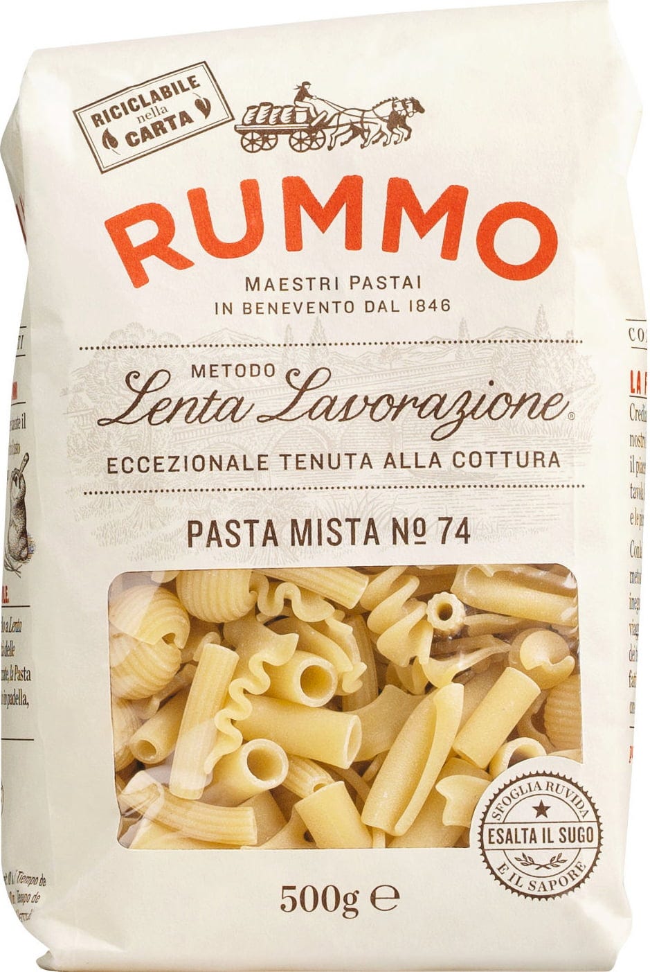 La Pasta Mista N°74 de Rummo es una mezcla variada de formas que hace que cada plato sea interesante y rico en texturas. Esta combinación nace de la idea de combinar diferentes formas de pasta para conseguir un resultado dinámico y siempre diferente en el plato.